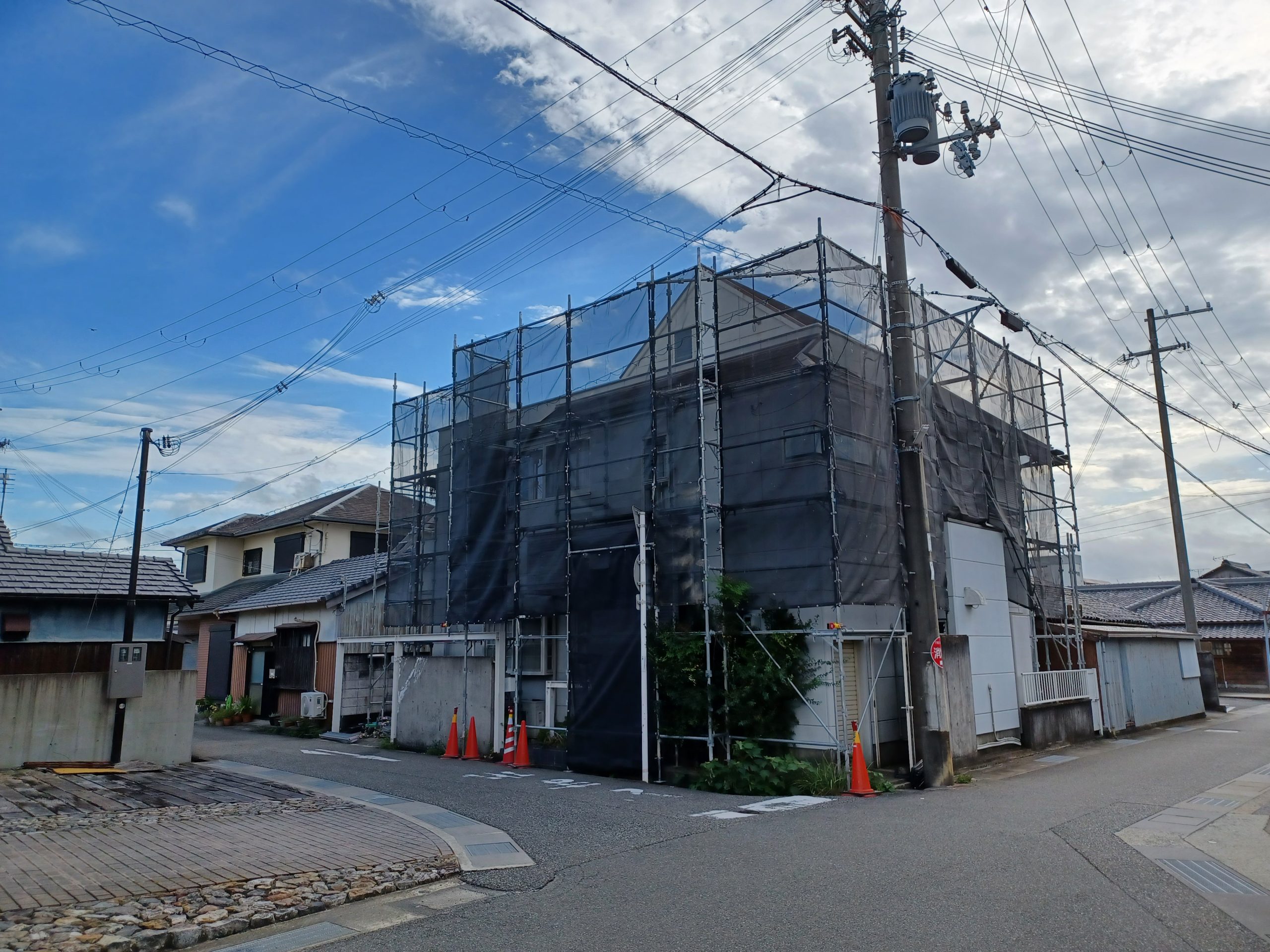 足場組立作業が完了しました。安全を確保した上で、施工を開始いたします。