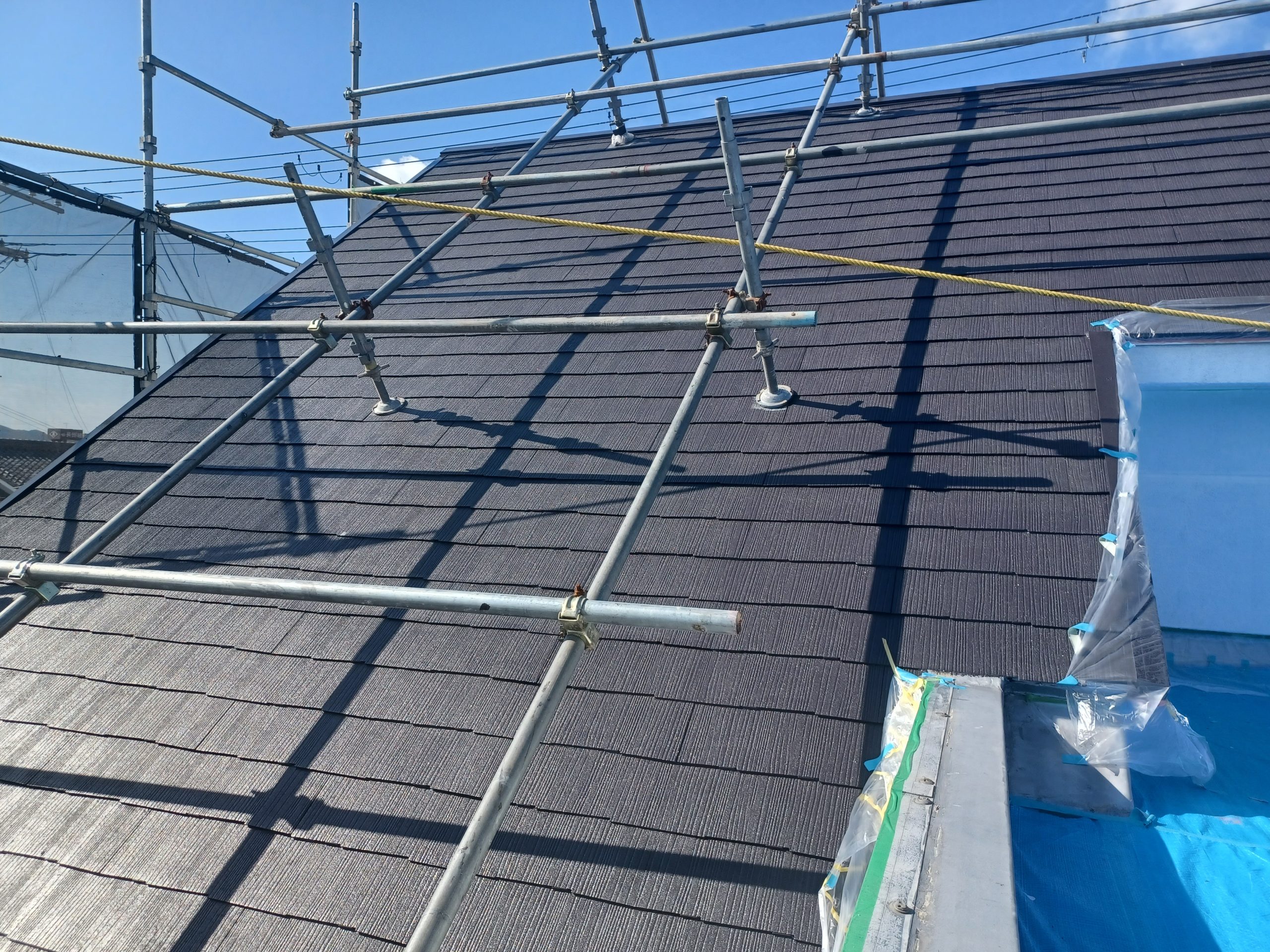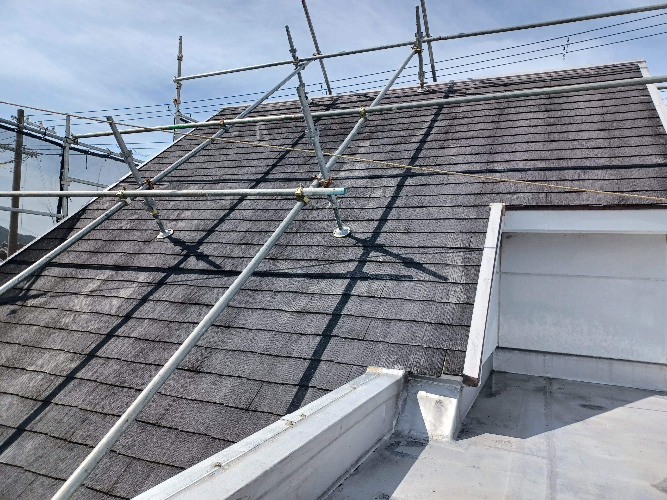 屋根の勾配が急なため、屋根用の足場も設置しました。高所作業も安全に行える体制です。