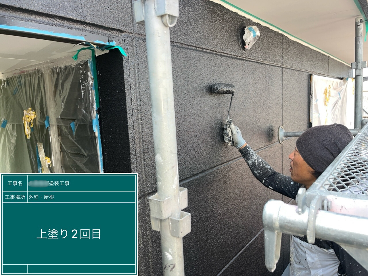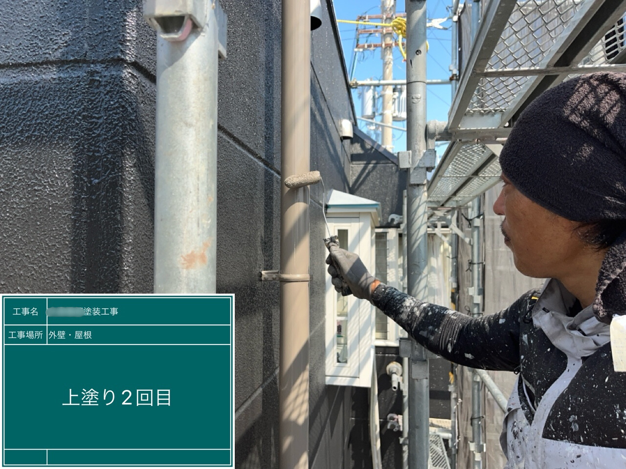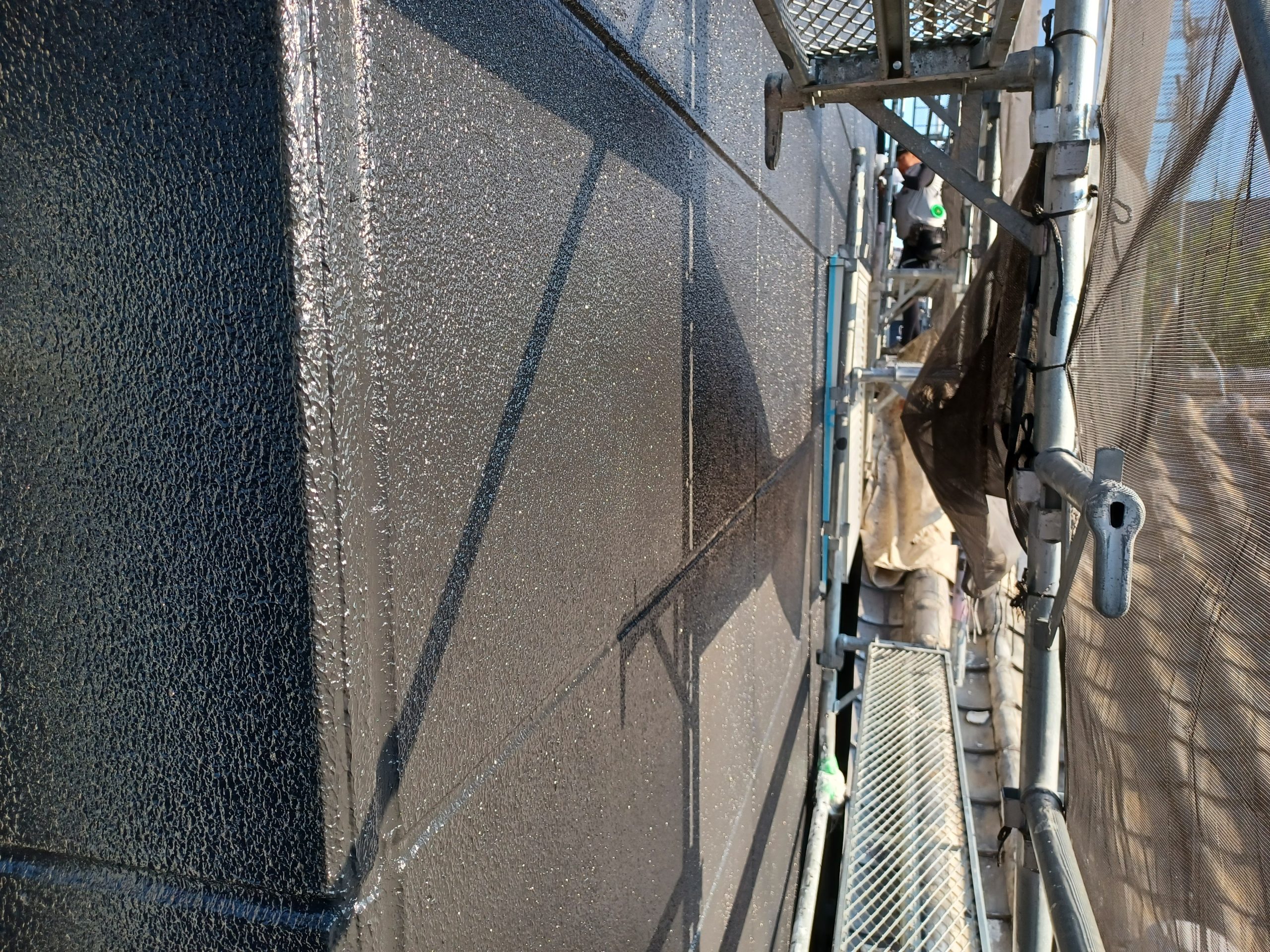 上塗り材を2回塗装して仕上げていきます。色ムラのない美しい外観を目指して丁寧に施工しています。