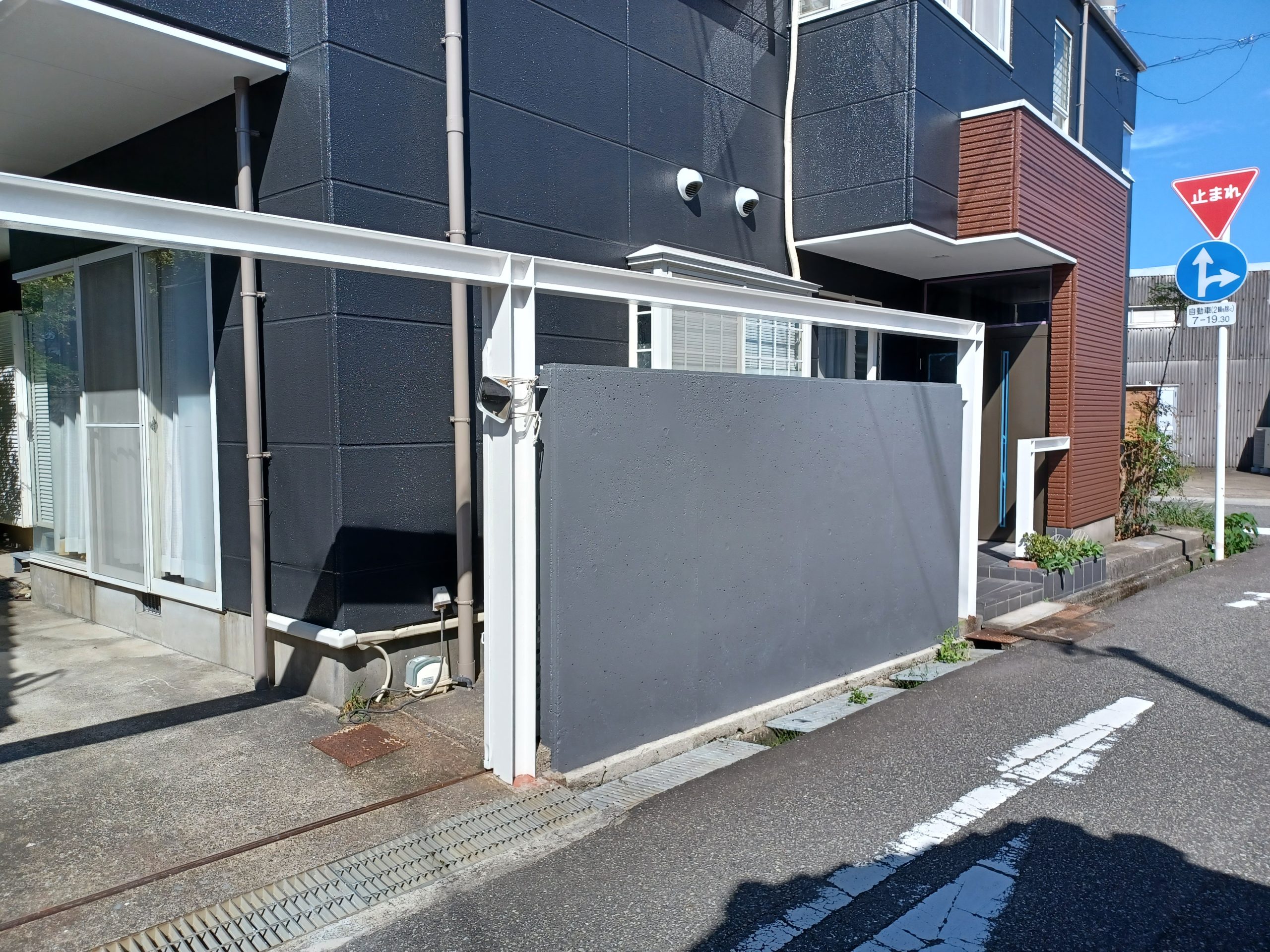 コンクリ塀も外壁と同系のグレーで統一し、全体がまとまりのある落ち着いた雰囲気に。