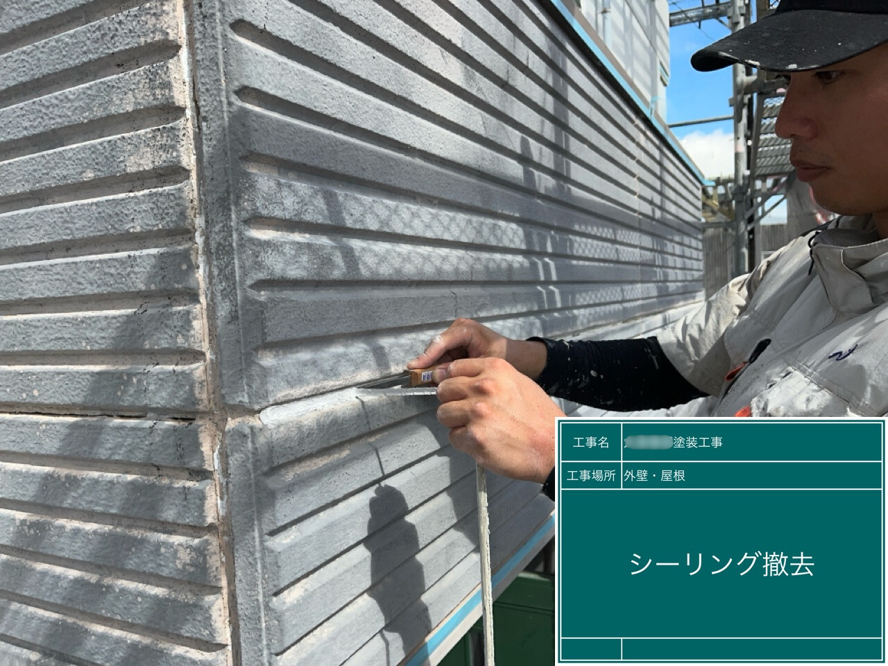 古くなった既存シーリングを丁寧に撤去しています。下地を整える大切な作業です。