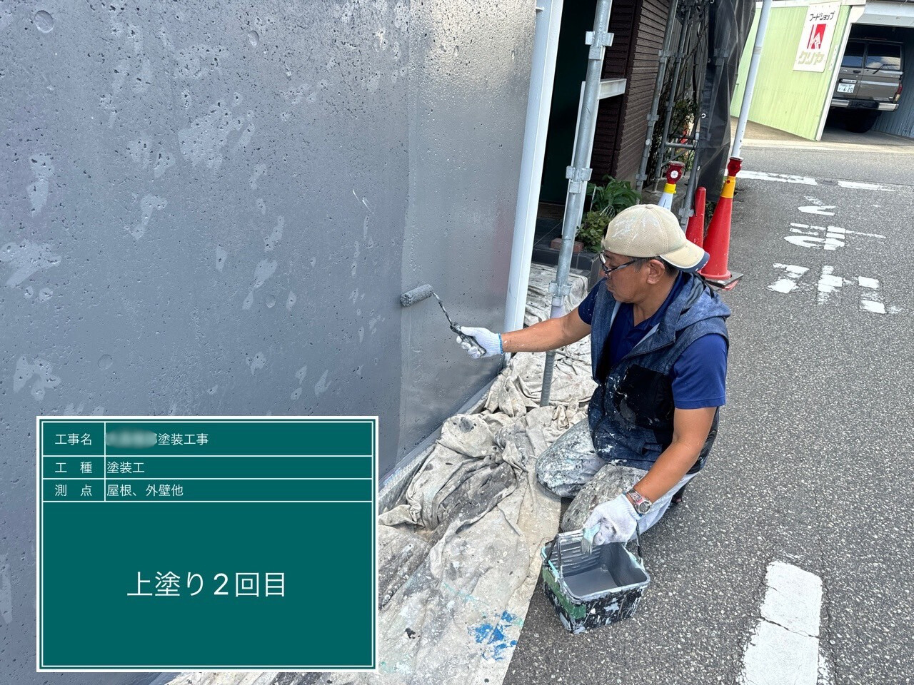 コンクリ塀の上塗り作業中です。下地からしっかり仕上げることで、長持ちする塗装になります。