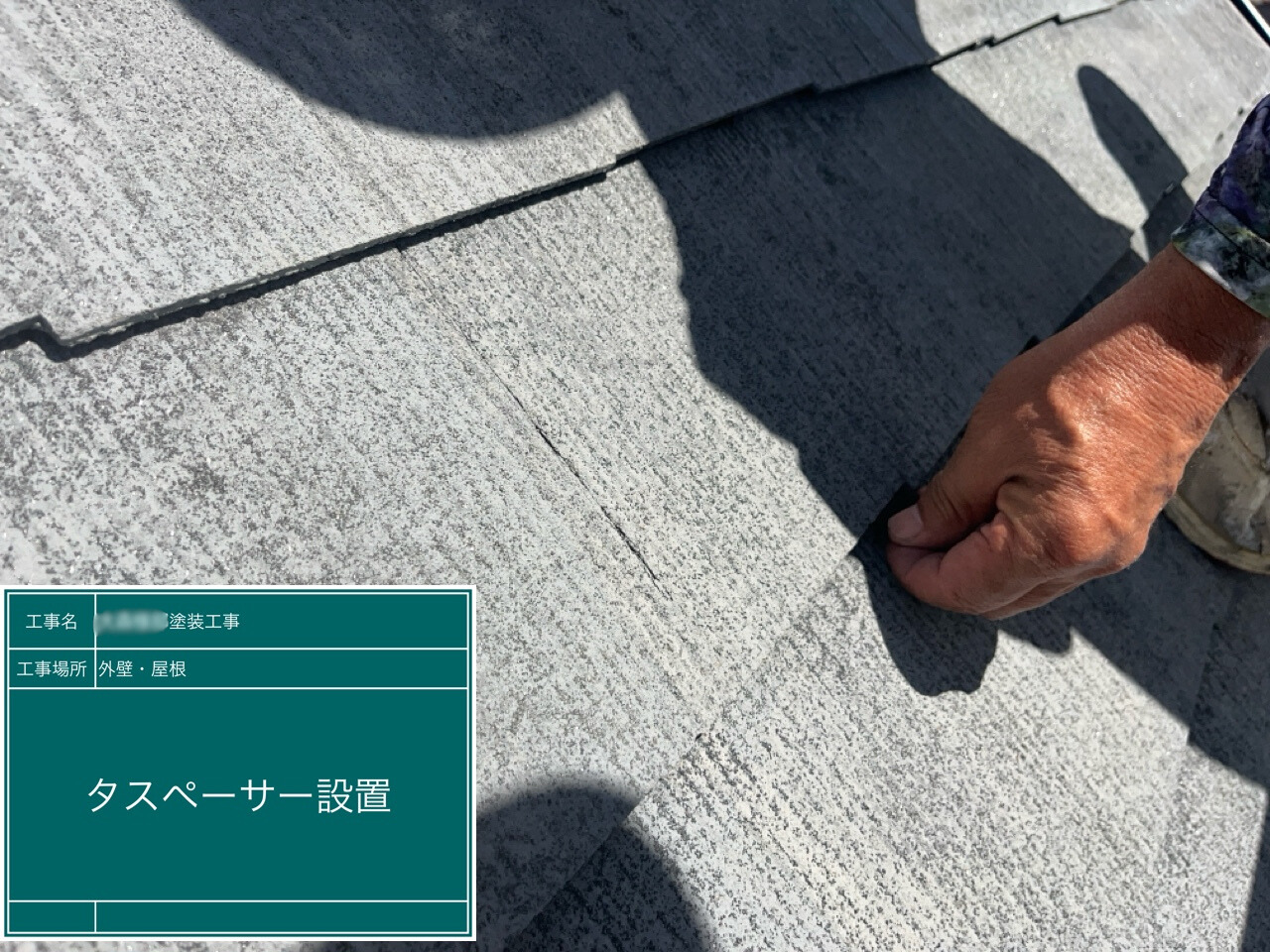 平板スレート屋根の縁切り作業として、タスペーサーを取り付けました。雨水がしっかり流れるようにする、大切な作業です。