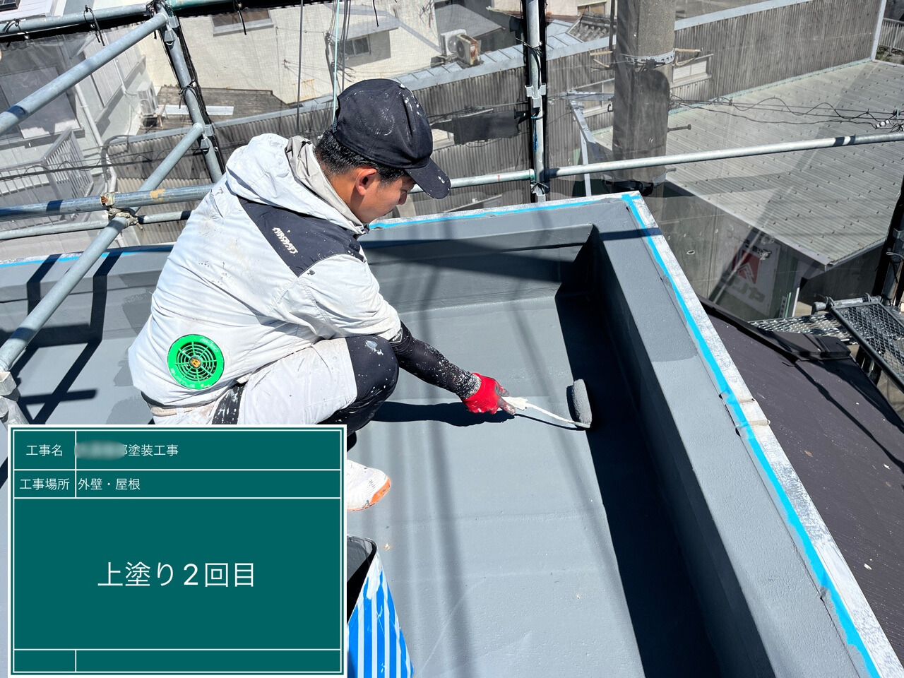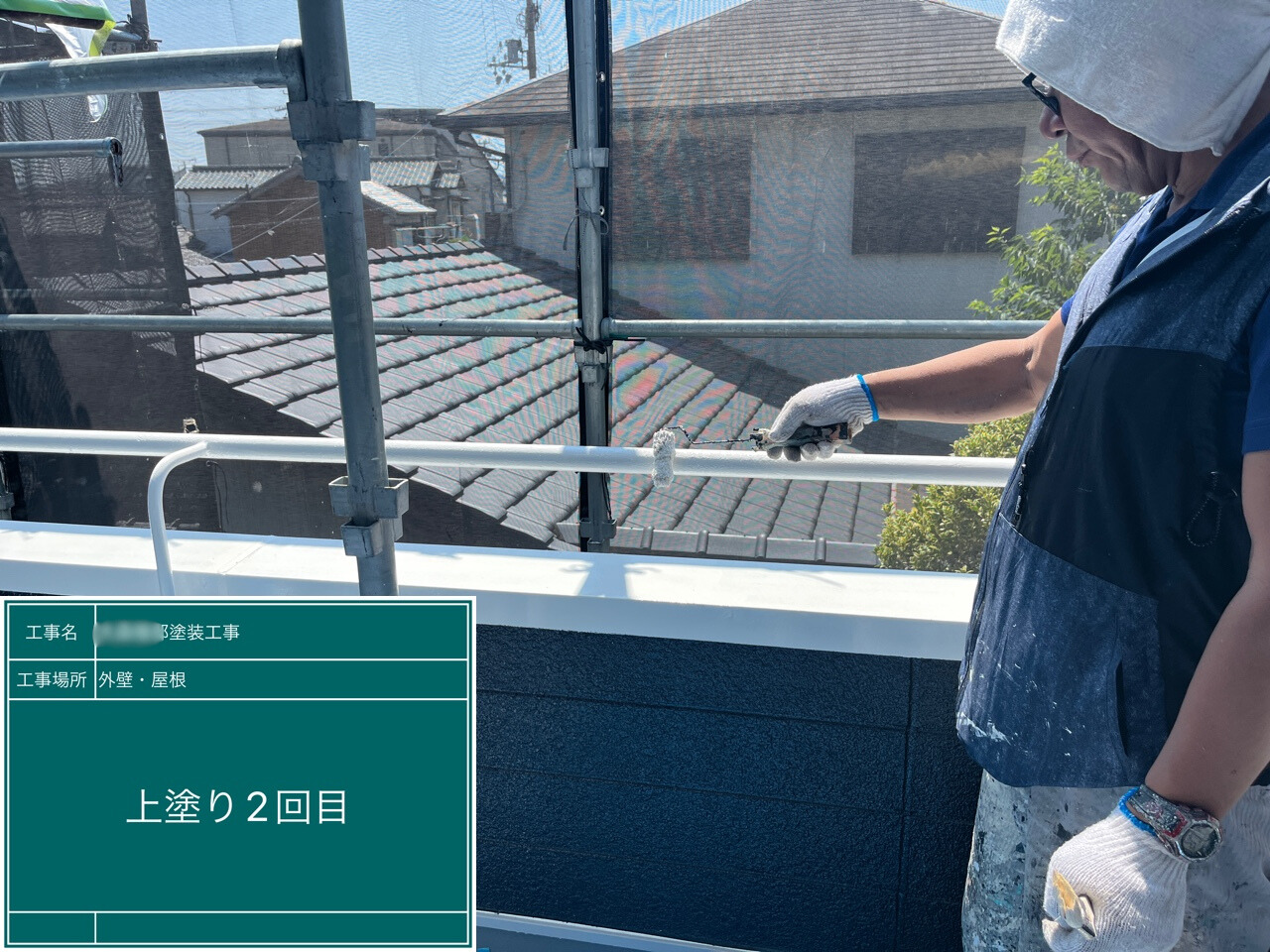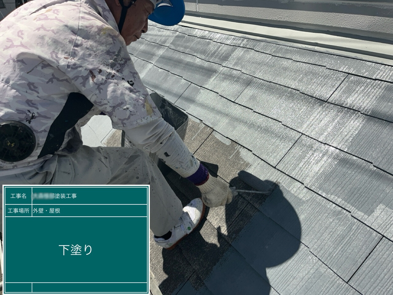 屋根の下塗りを施工中です。下塗りは、仕上げ塗料をしっかり屋根に密着させるための大切な準備作業です。