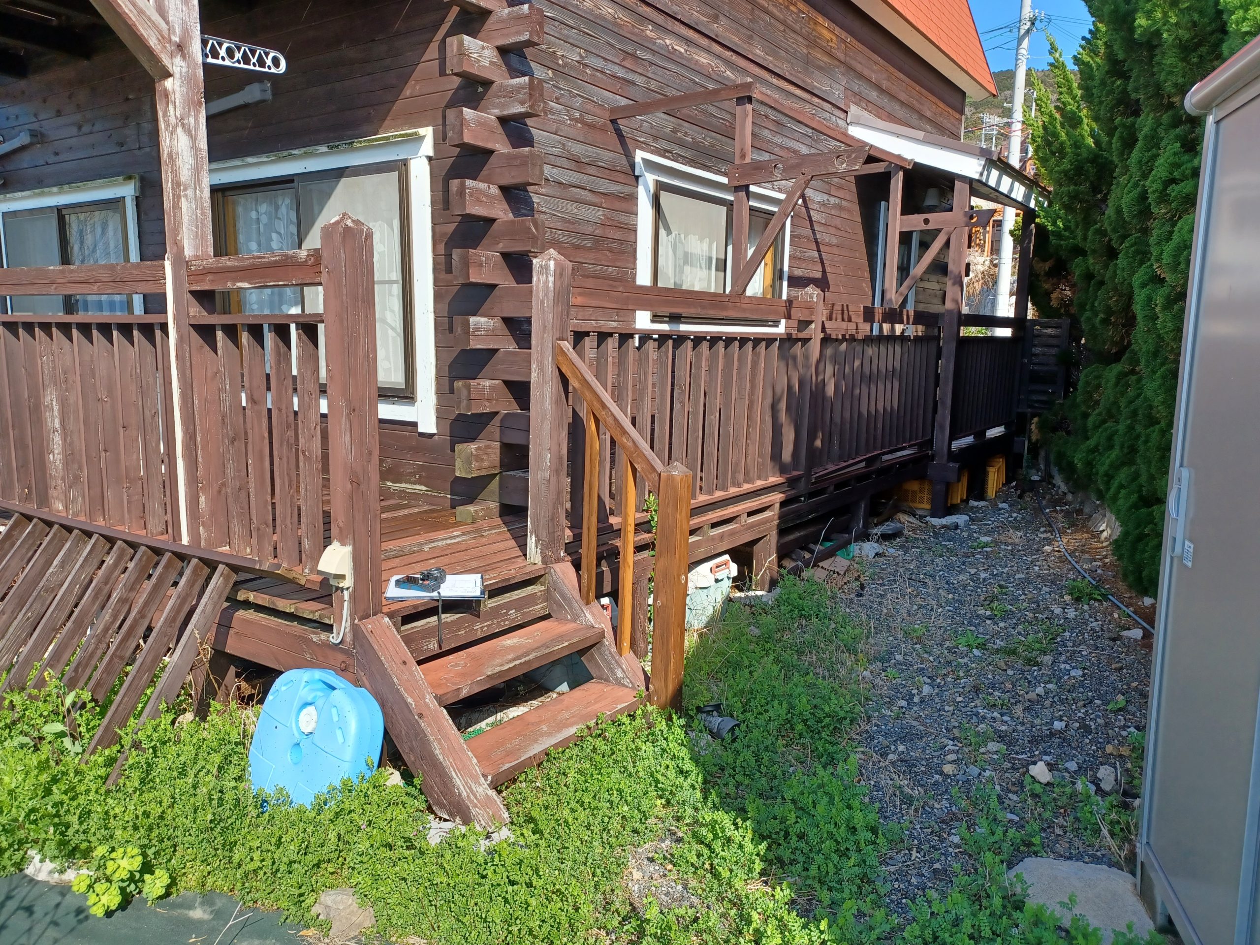 テラスの改修とログハウスの塗装工事をさせていただきました。