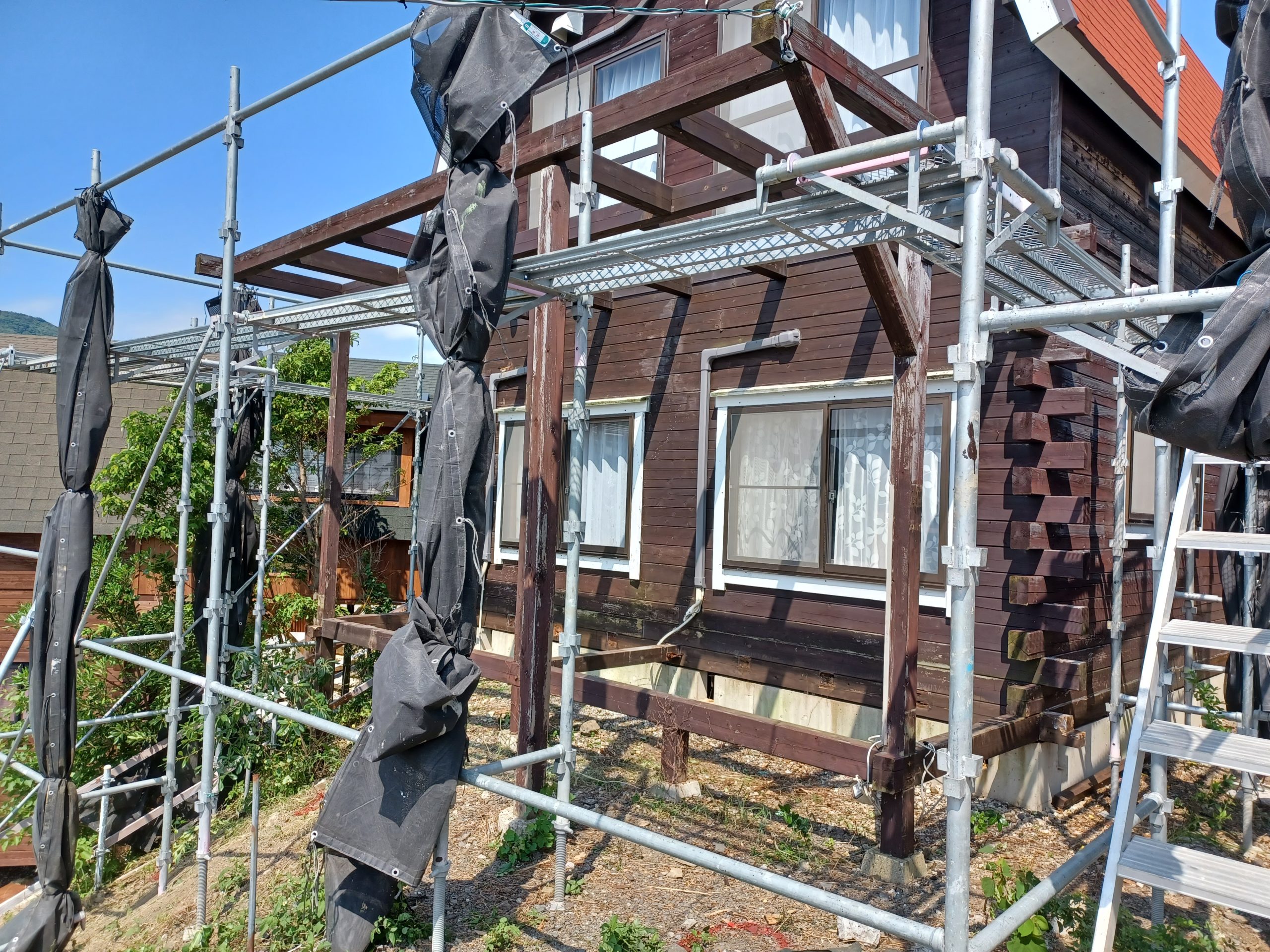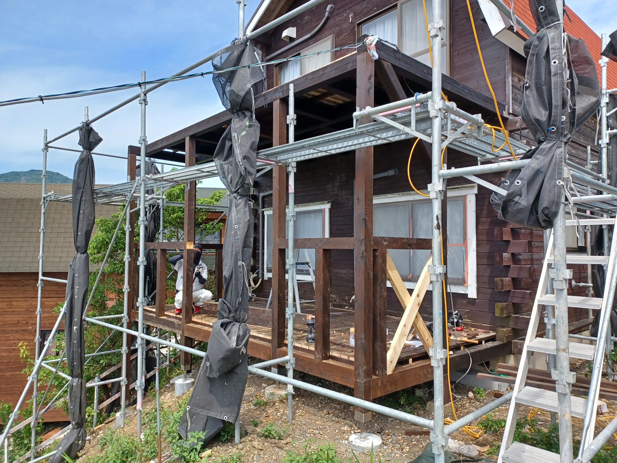 まずは足場を組み立て、安全を確保した上でテラスとデッキの解体作業を行いました。