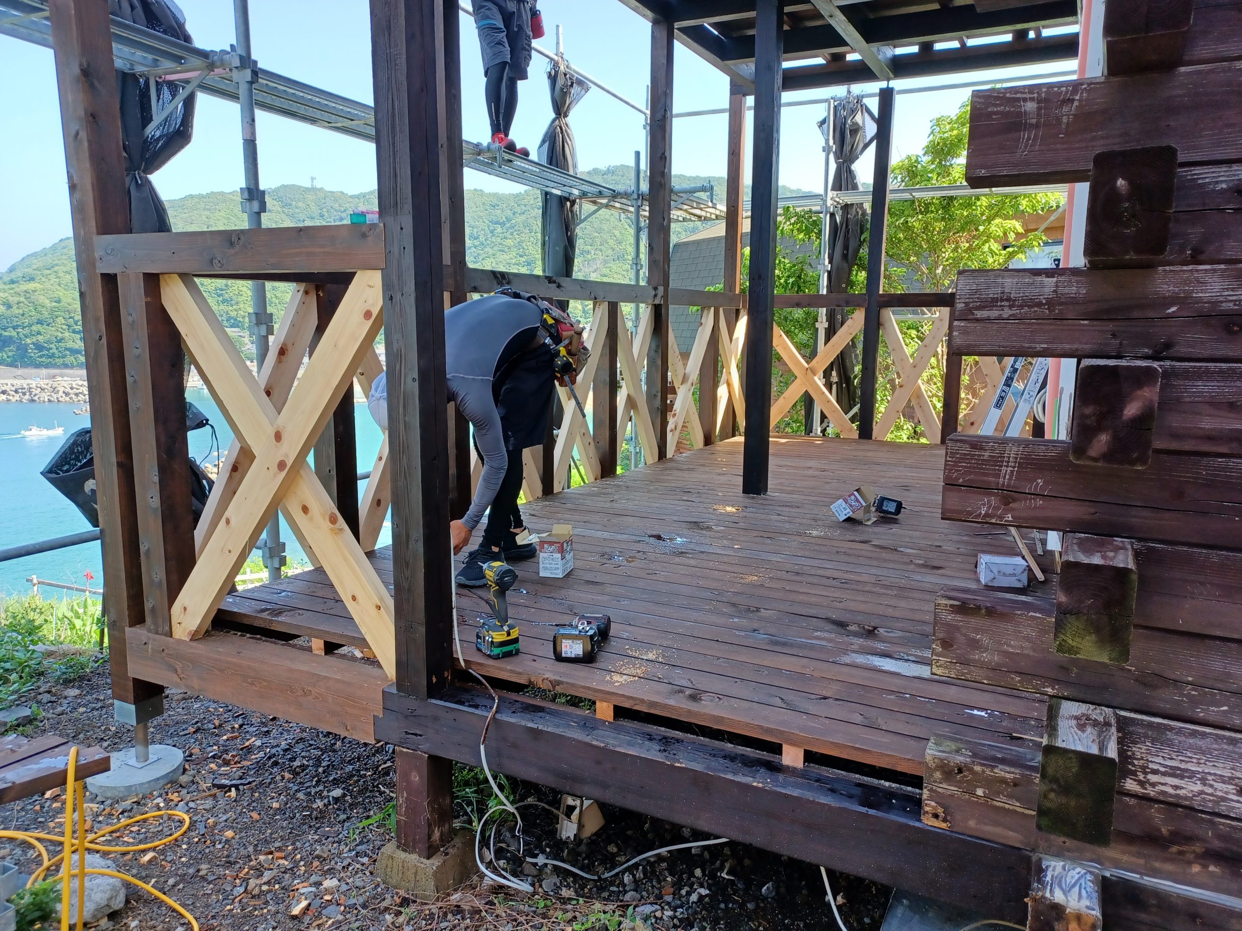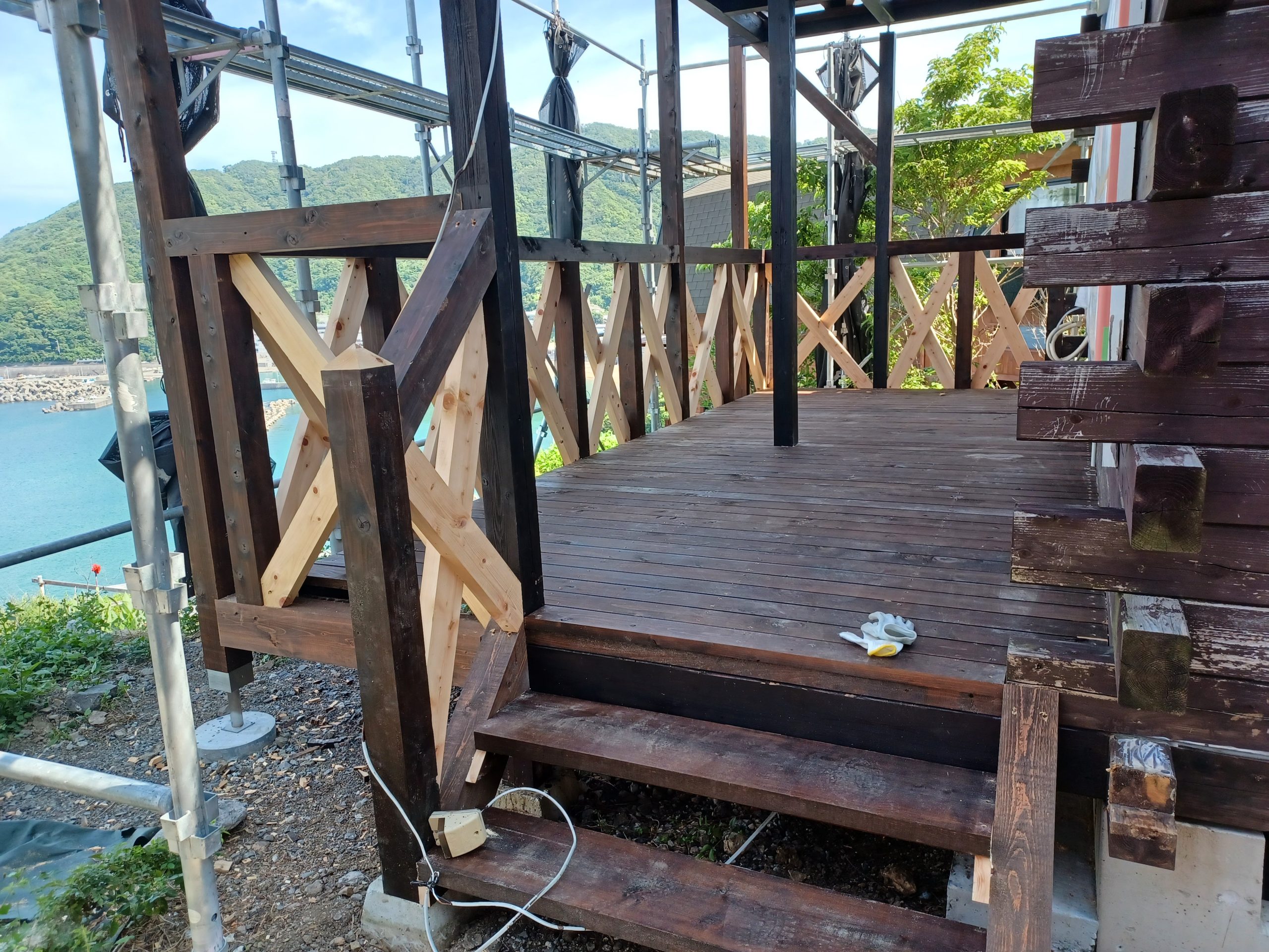 潮風による金物類の腐食や木材の劣化が進み、色褪せも目立ち、素地が露出している部分もありました。