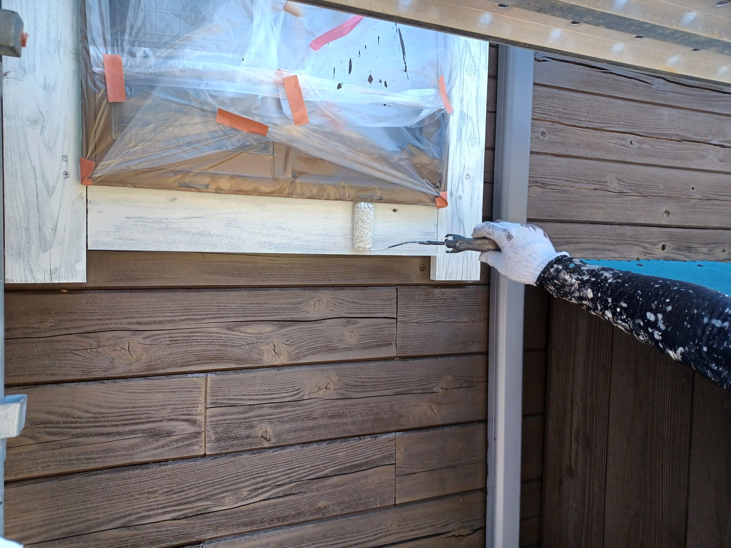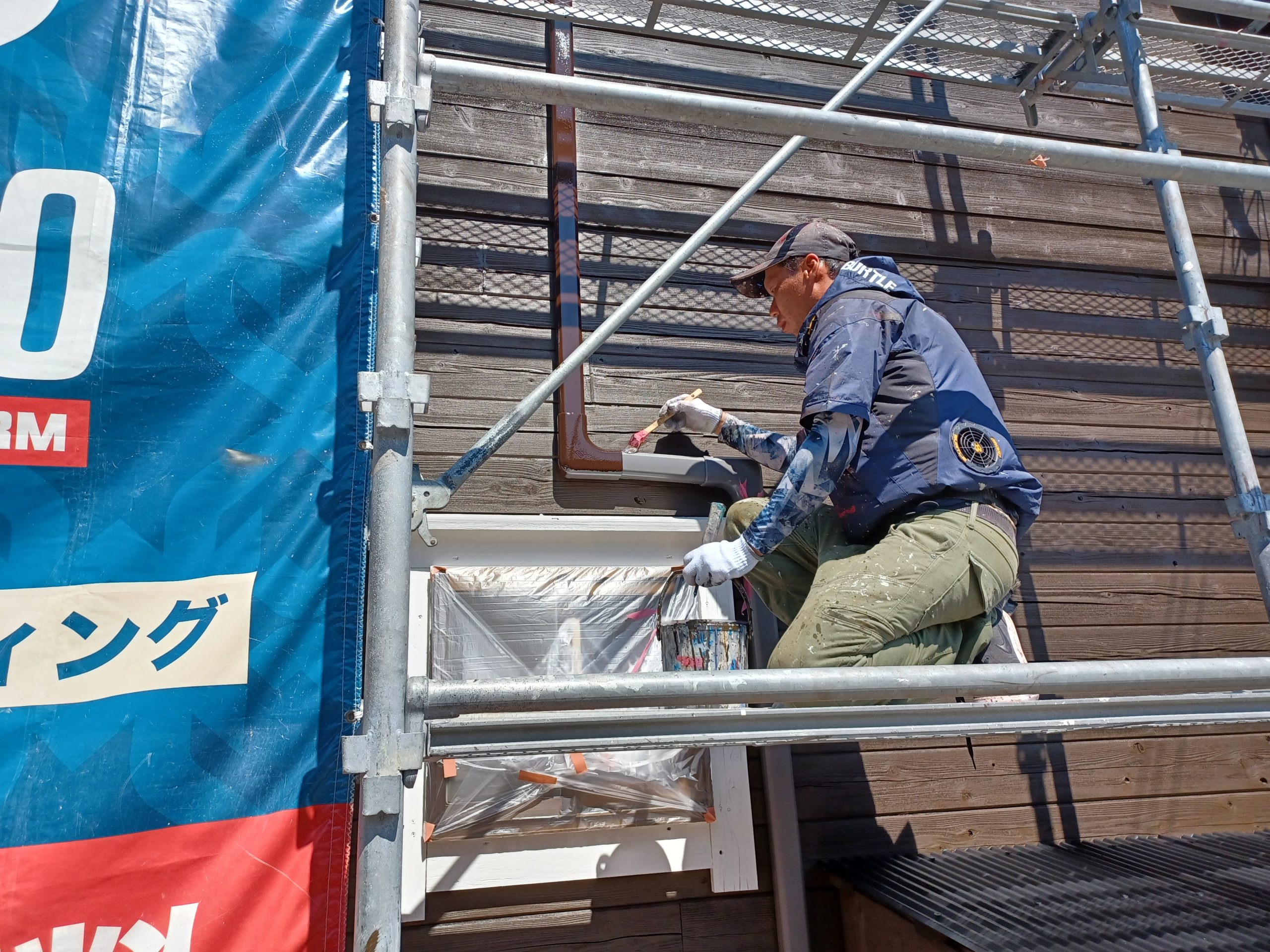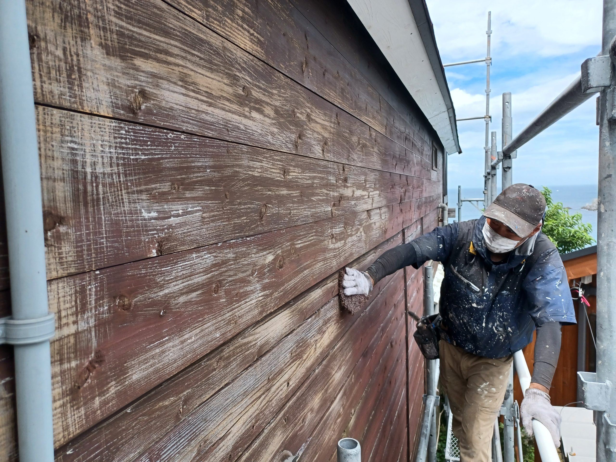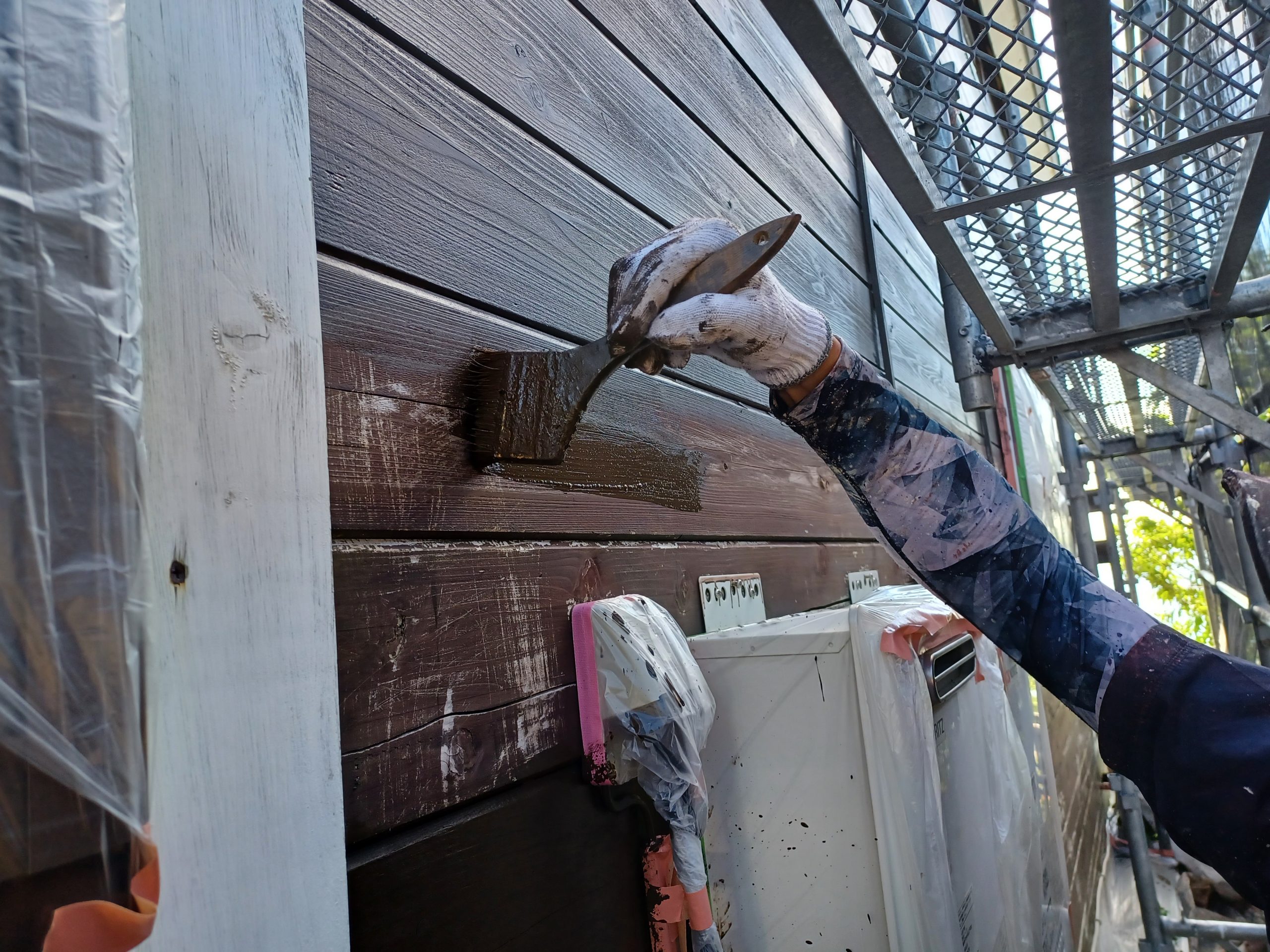 まず木部下塗りを施工し、その後上塗りを2回重ねることで、ムラのない美しい仕上がりと耐久性を確保しています。