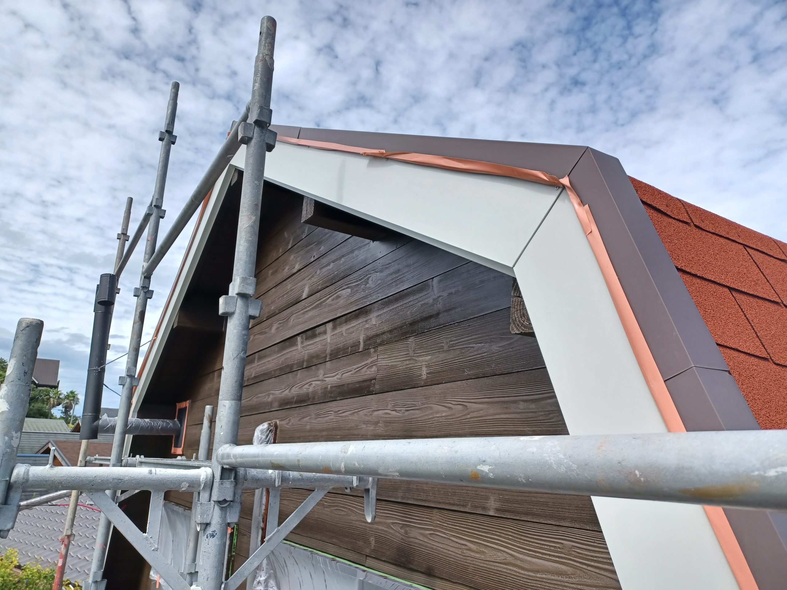 既存の破風板には一部朽ちている箇所があったため、損傷部分を差し替えた上で 板金破風巻き を施工しました。