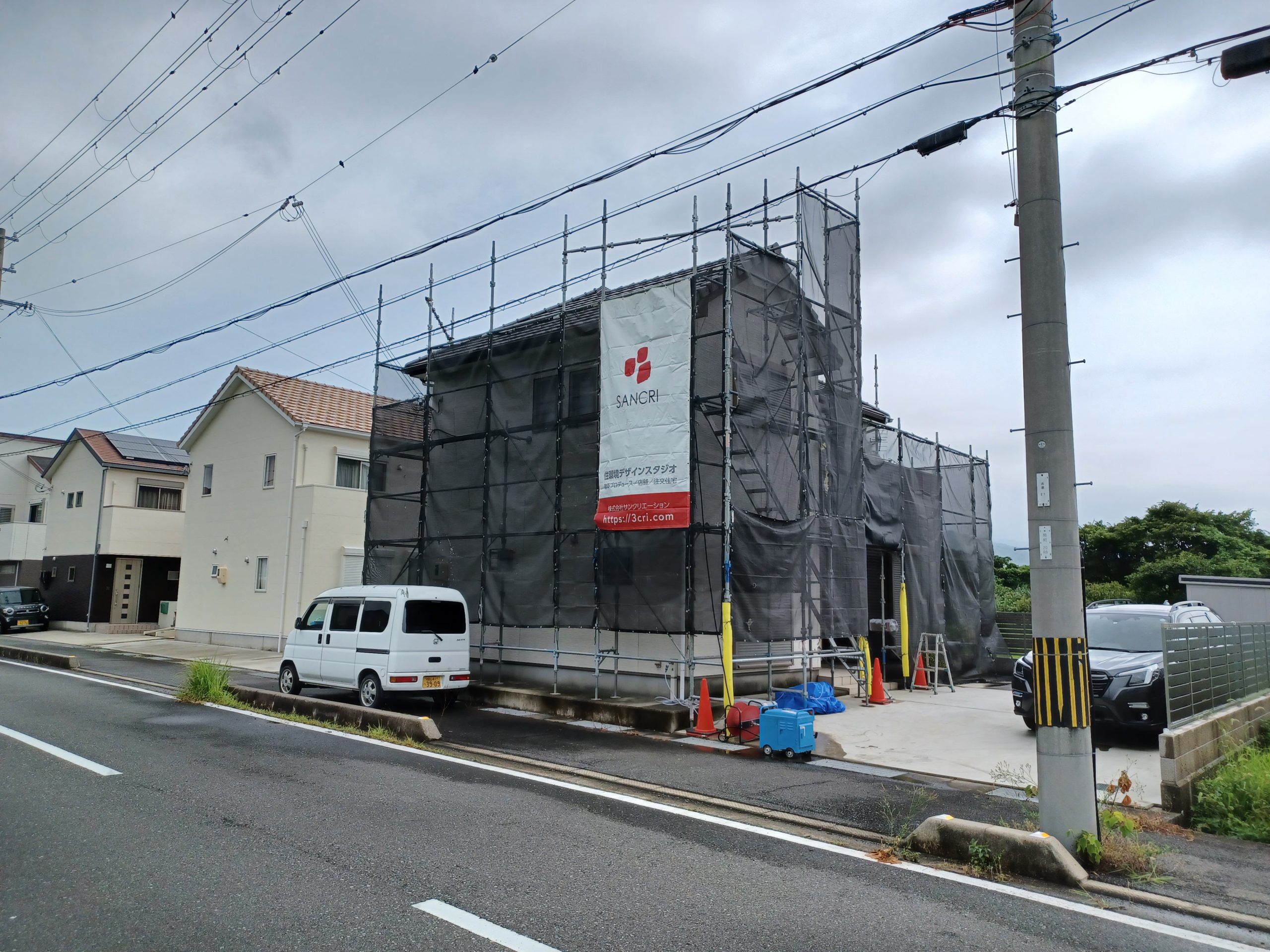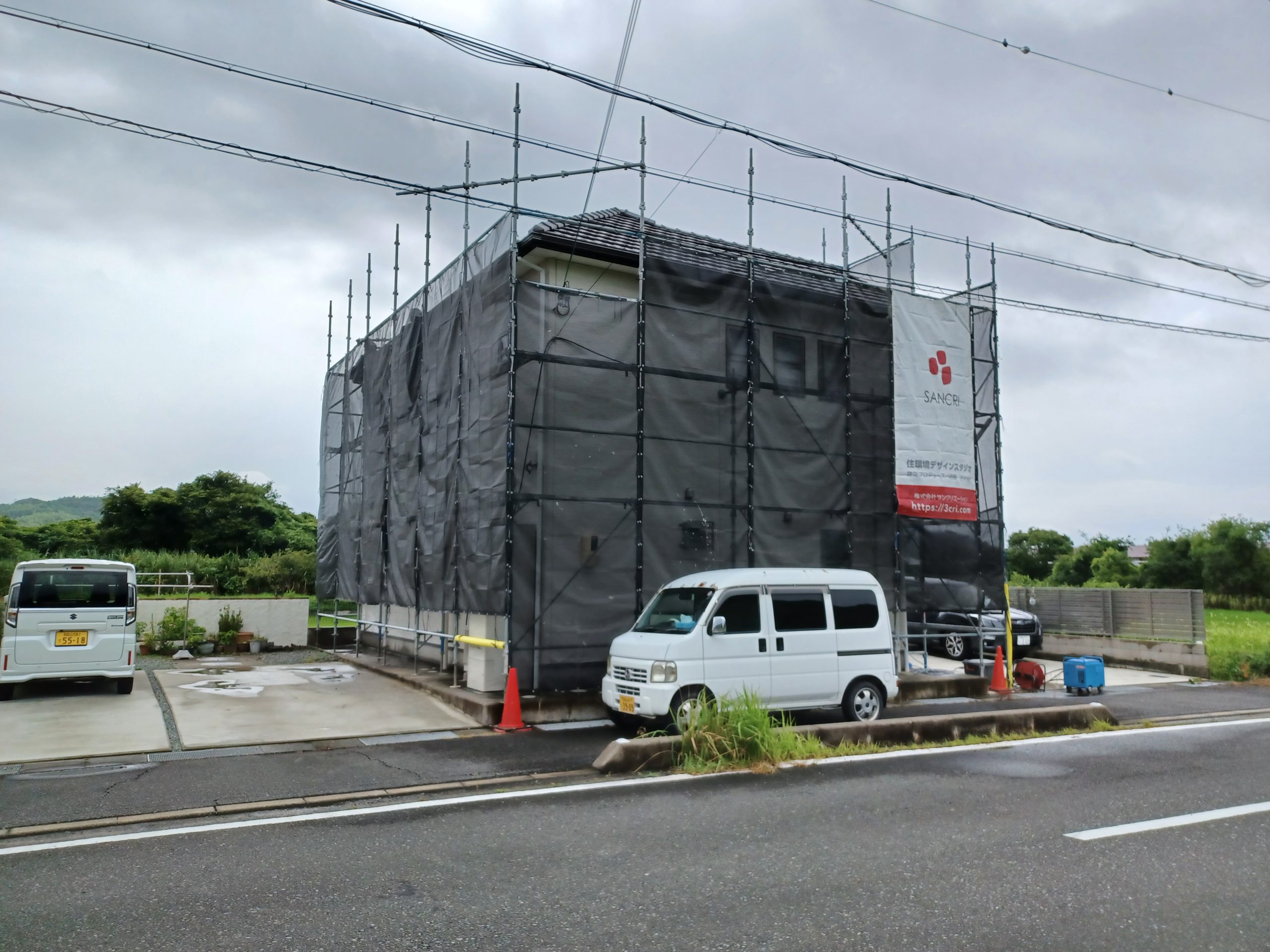 安全に作業を進めるため、まず建物全体に足場を設置しました。