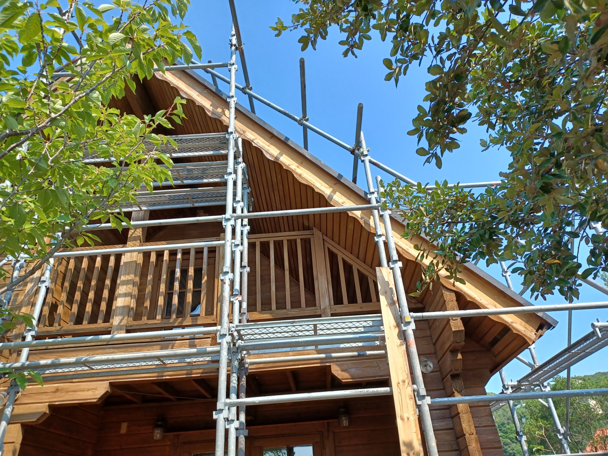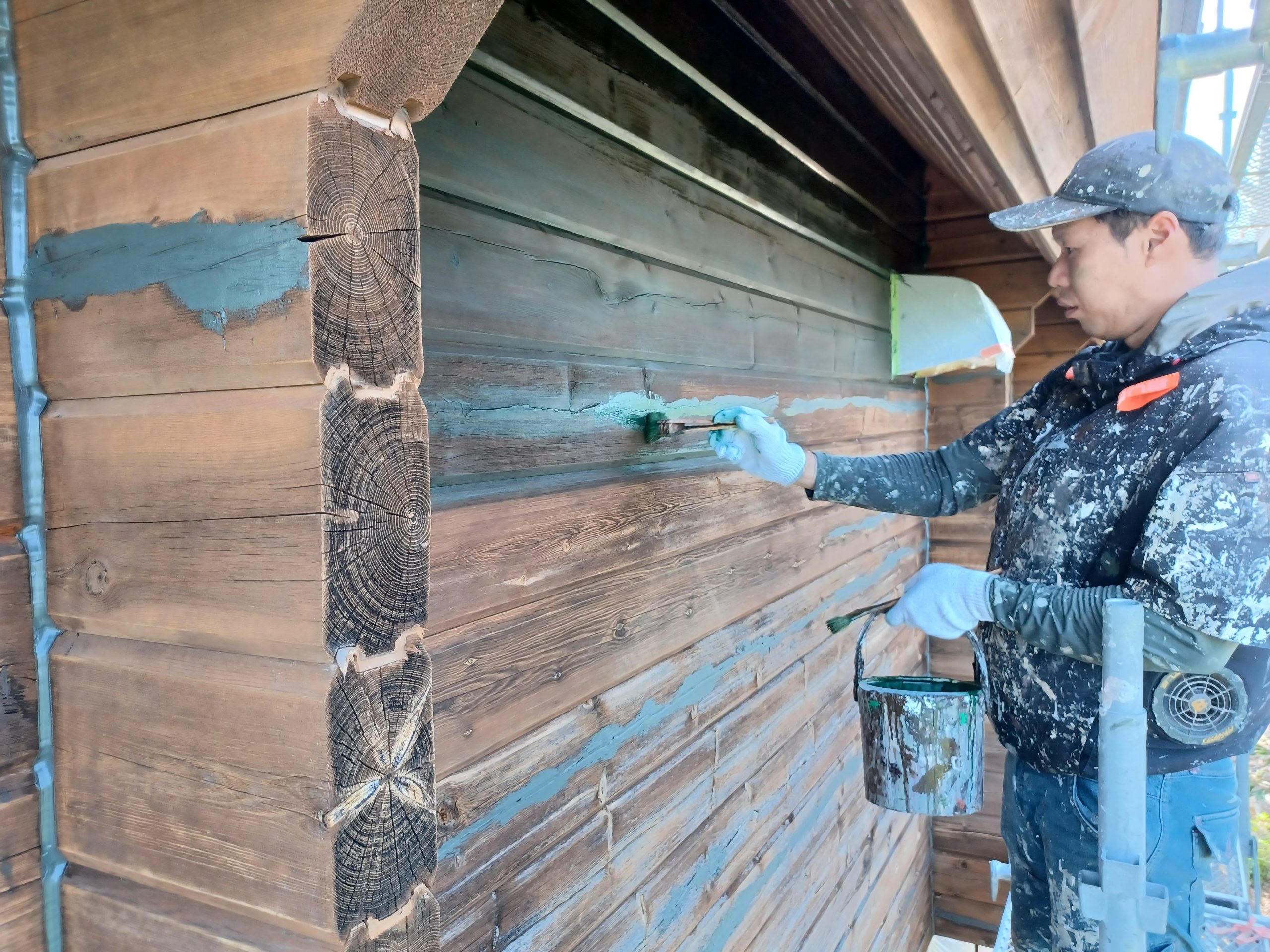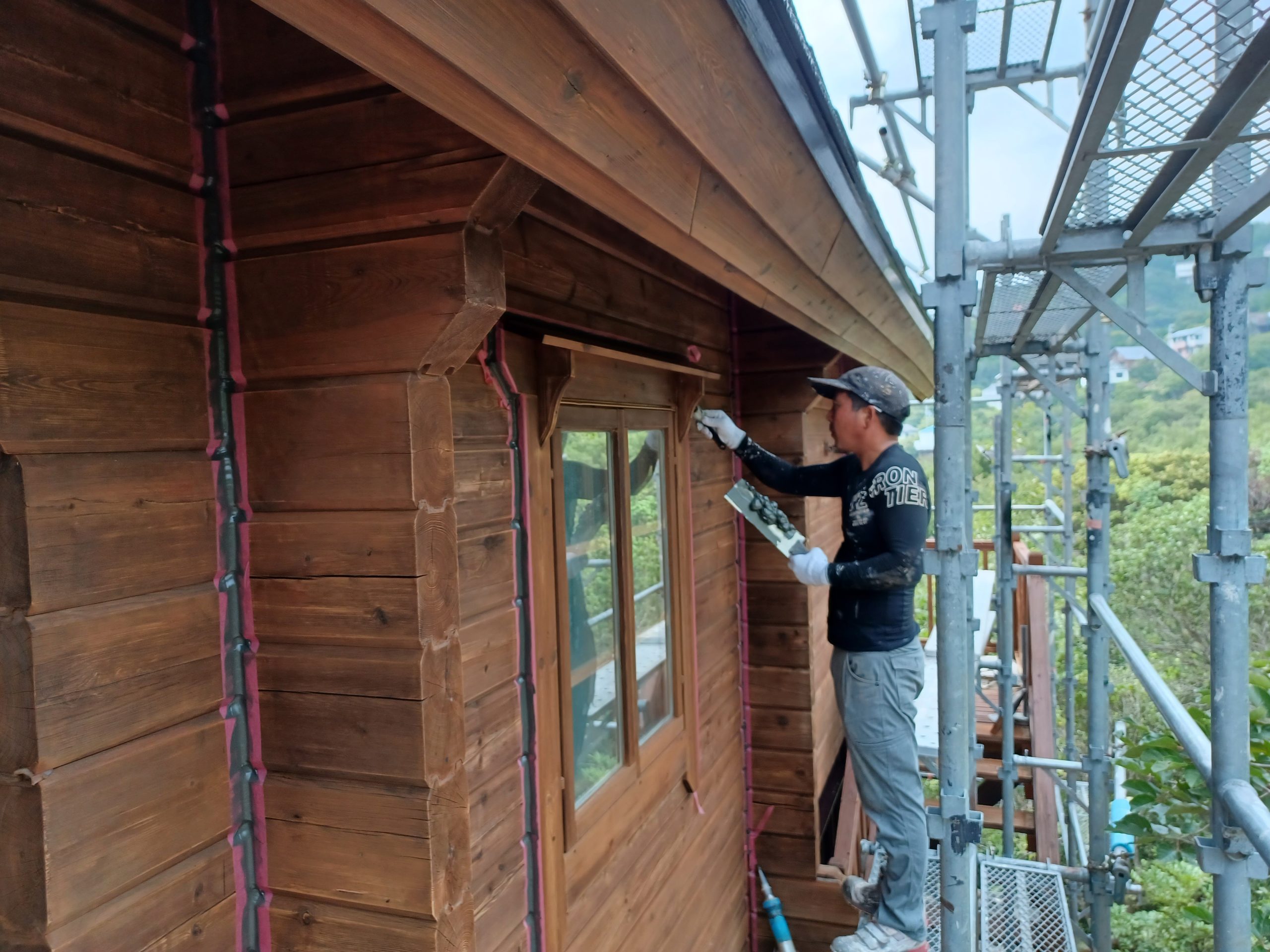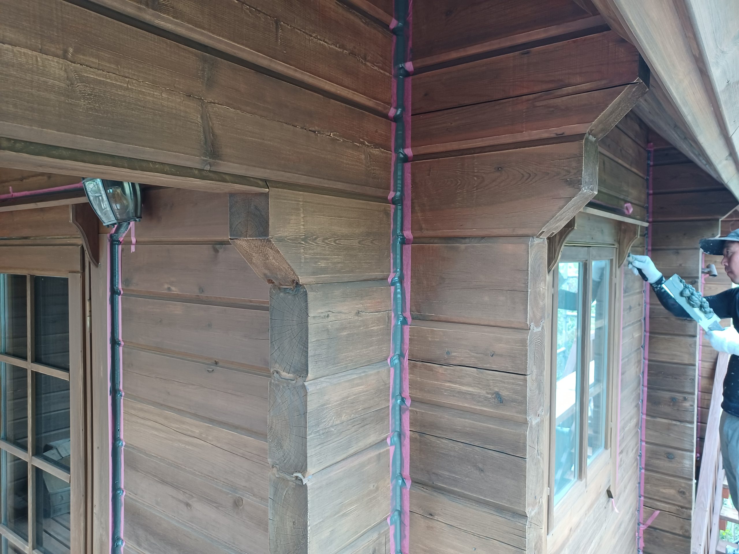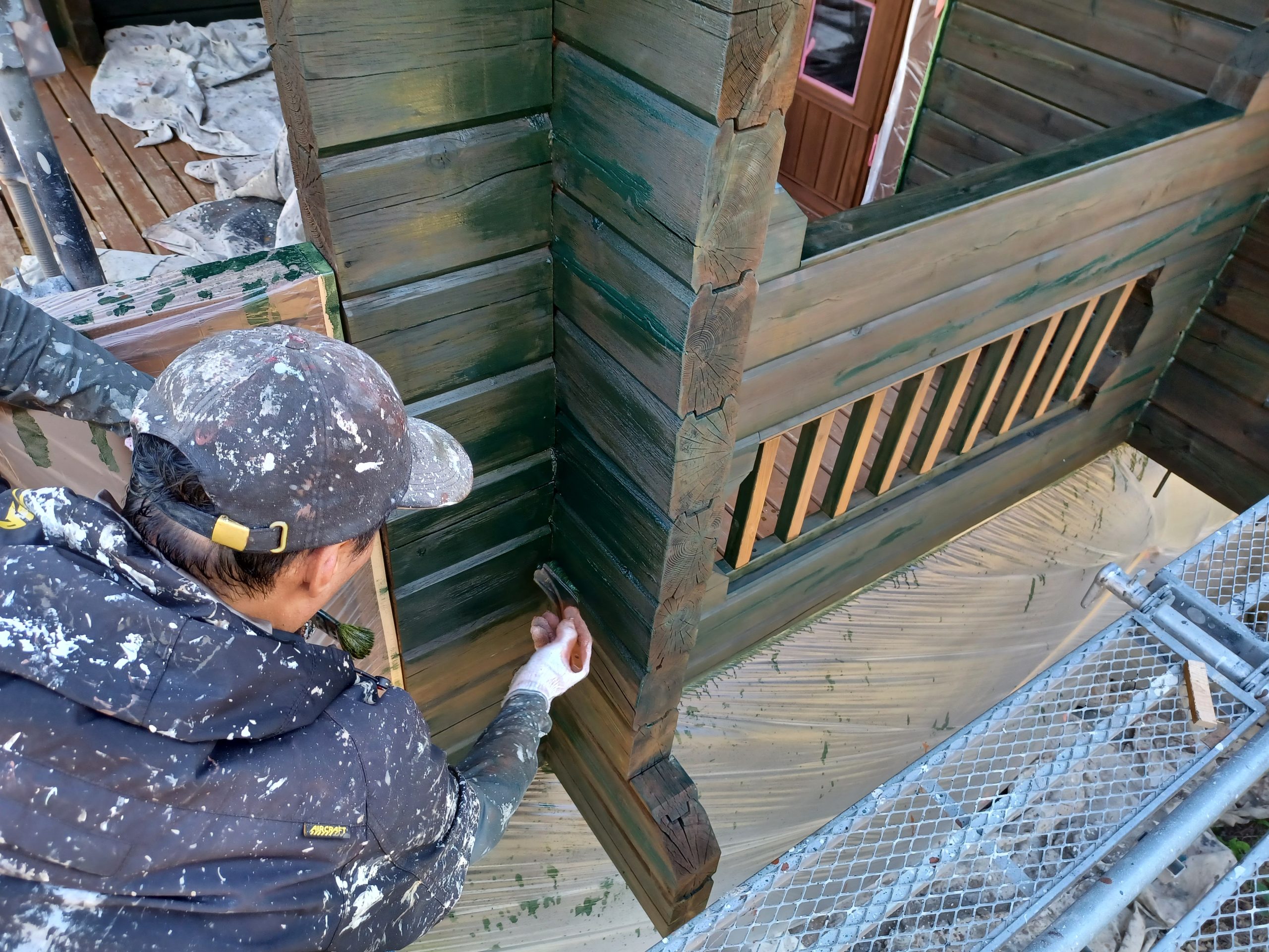 トップ 外装リフォーム施工事例ログハウスログハウス塗装|森に映えるツートン仕上げ