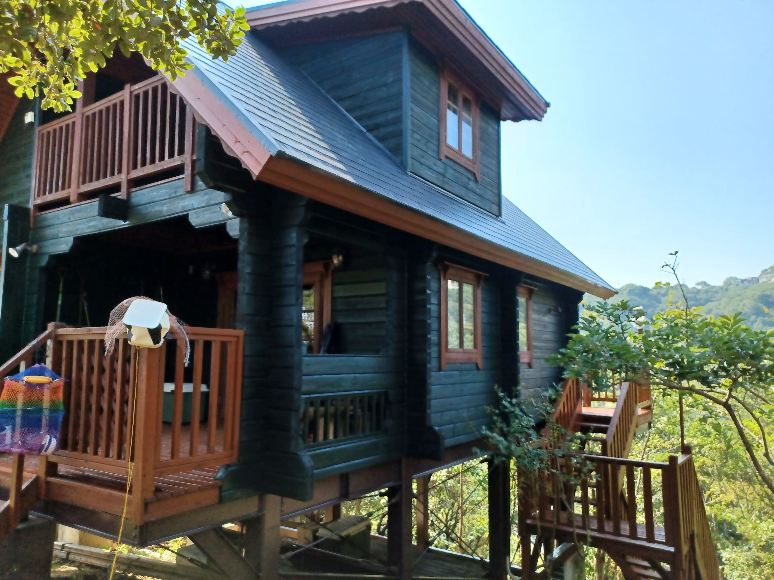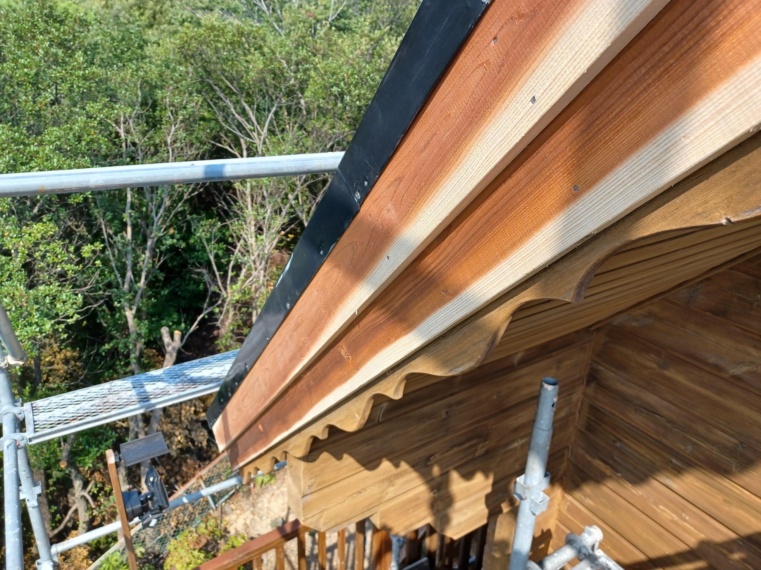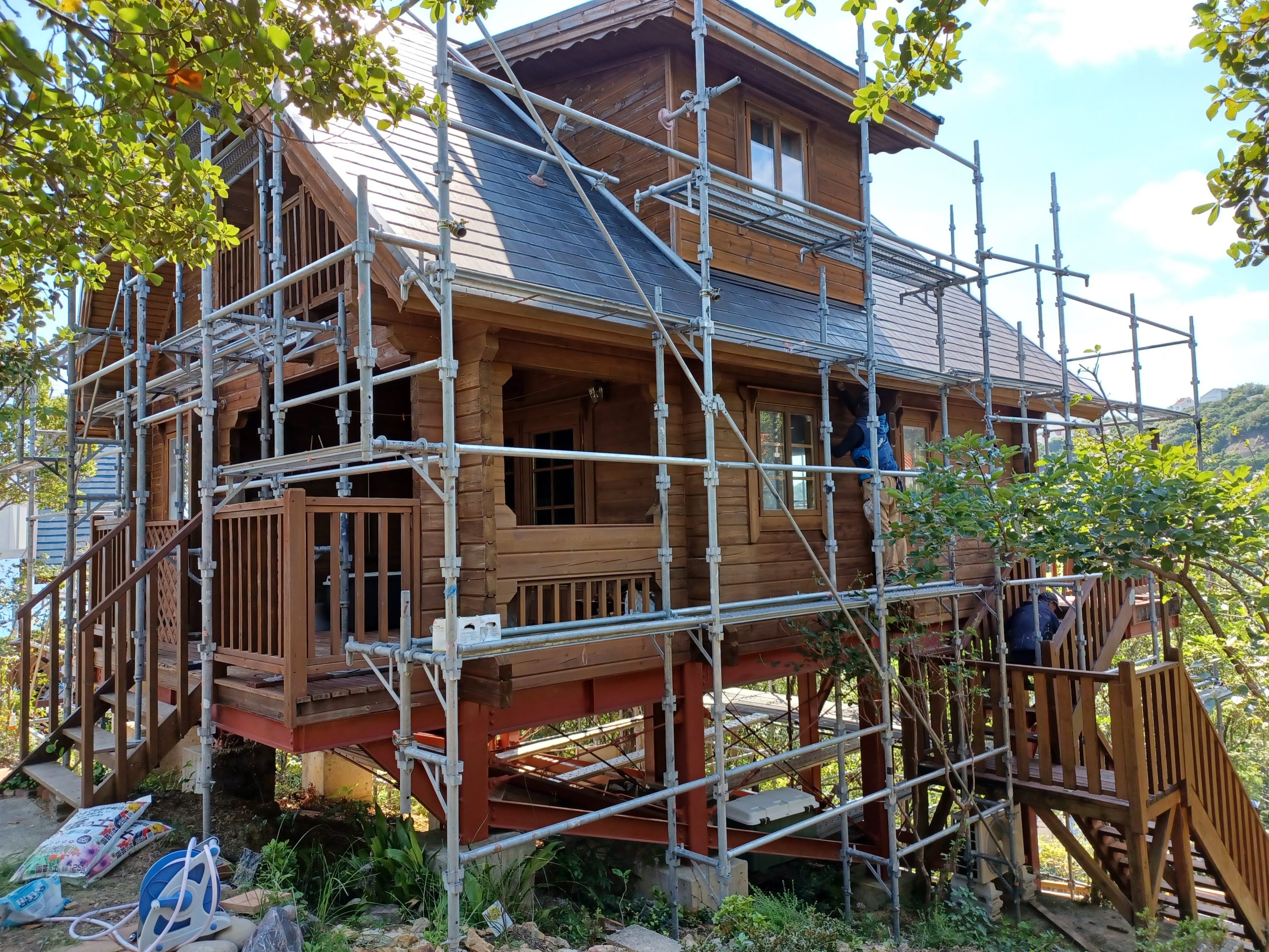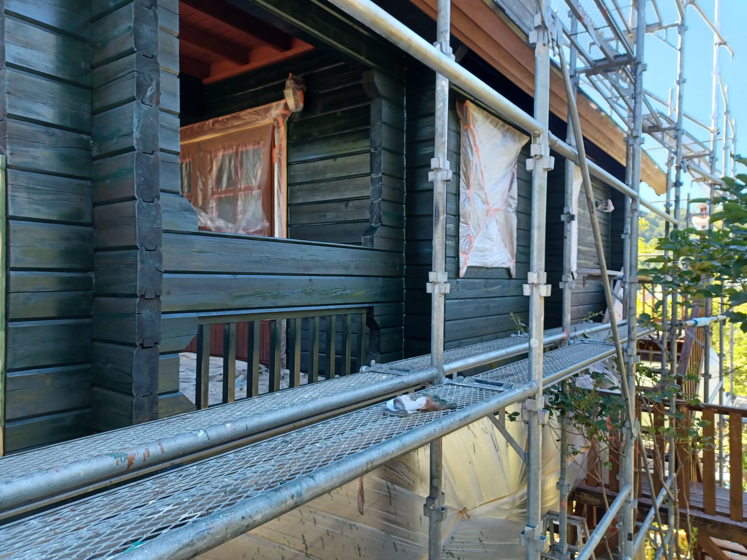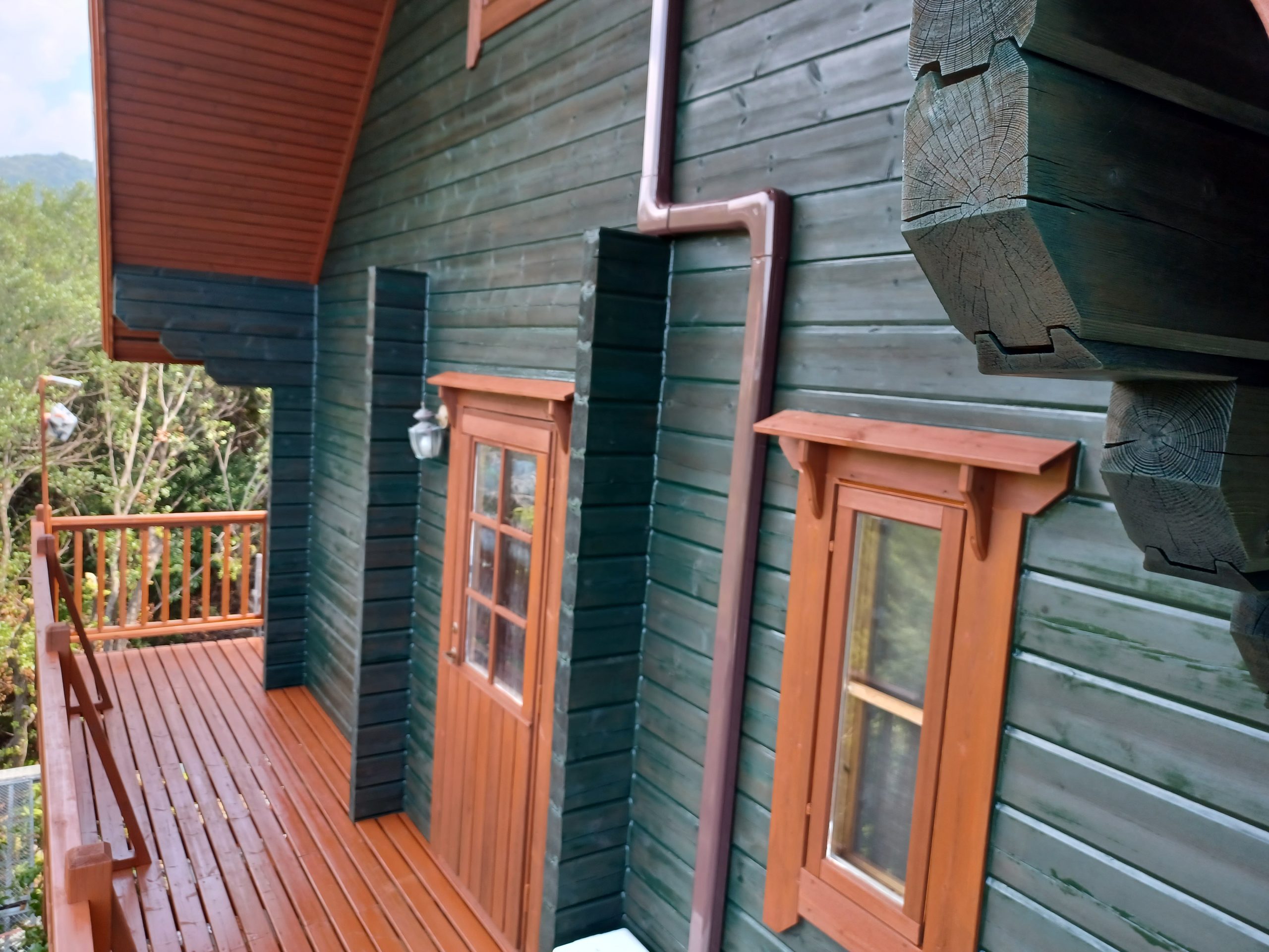 トップ 外装リフォーム施工事例ログハウスログハウス塗装|森に映えるツートン仕上げ