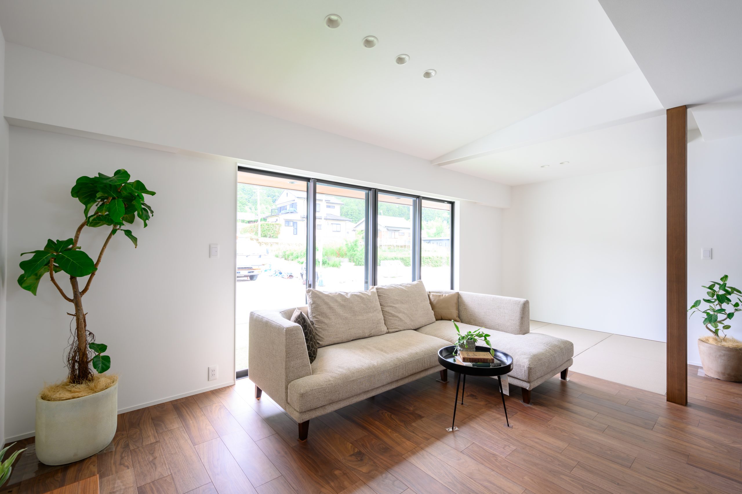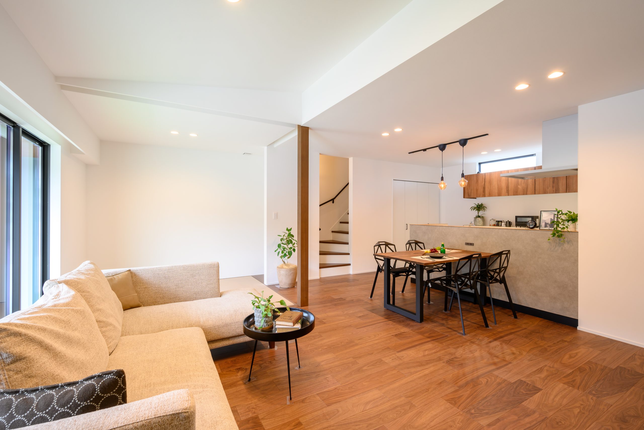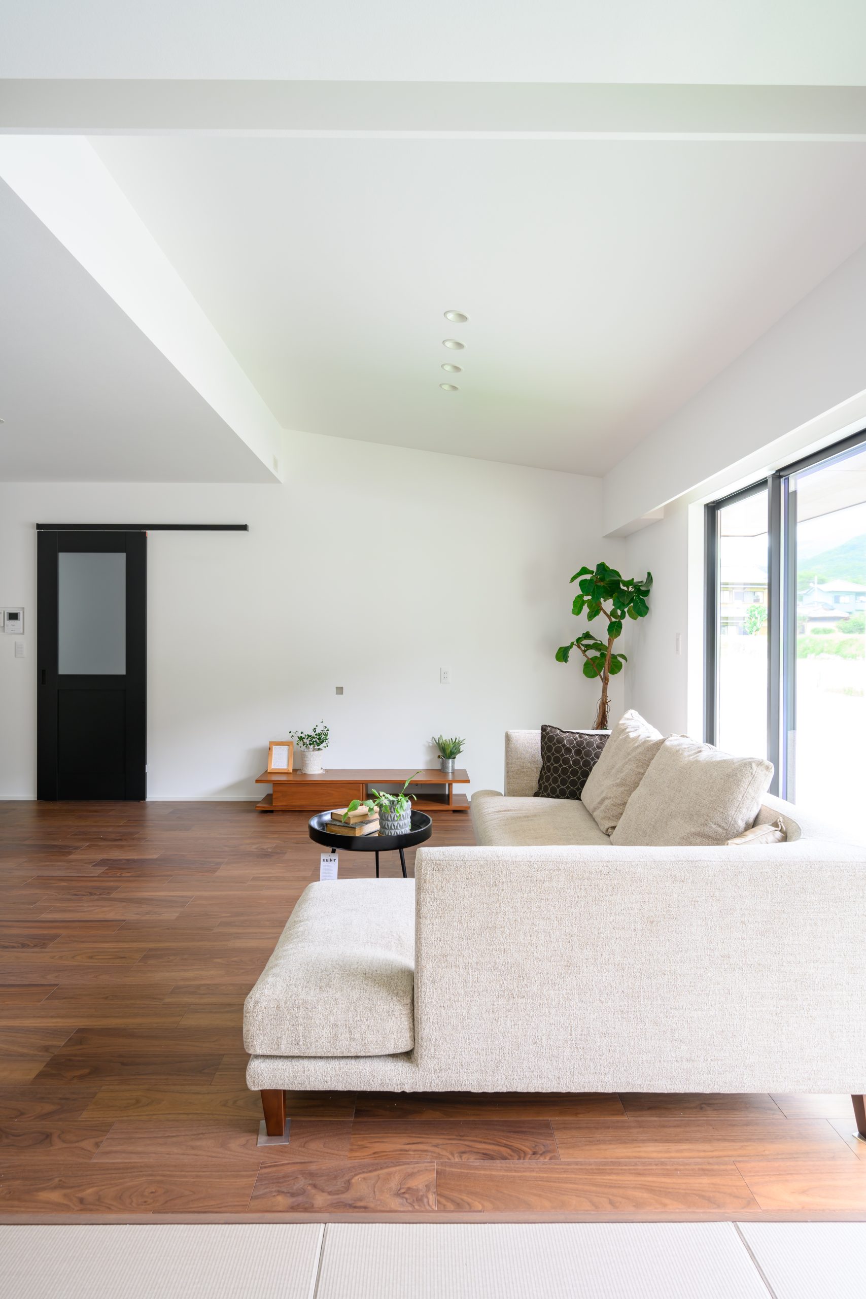 高く広がる勾配天井と、視界を遮らない大開口が、家族の集うリビングに圧倒的な開放感をもたらします。