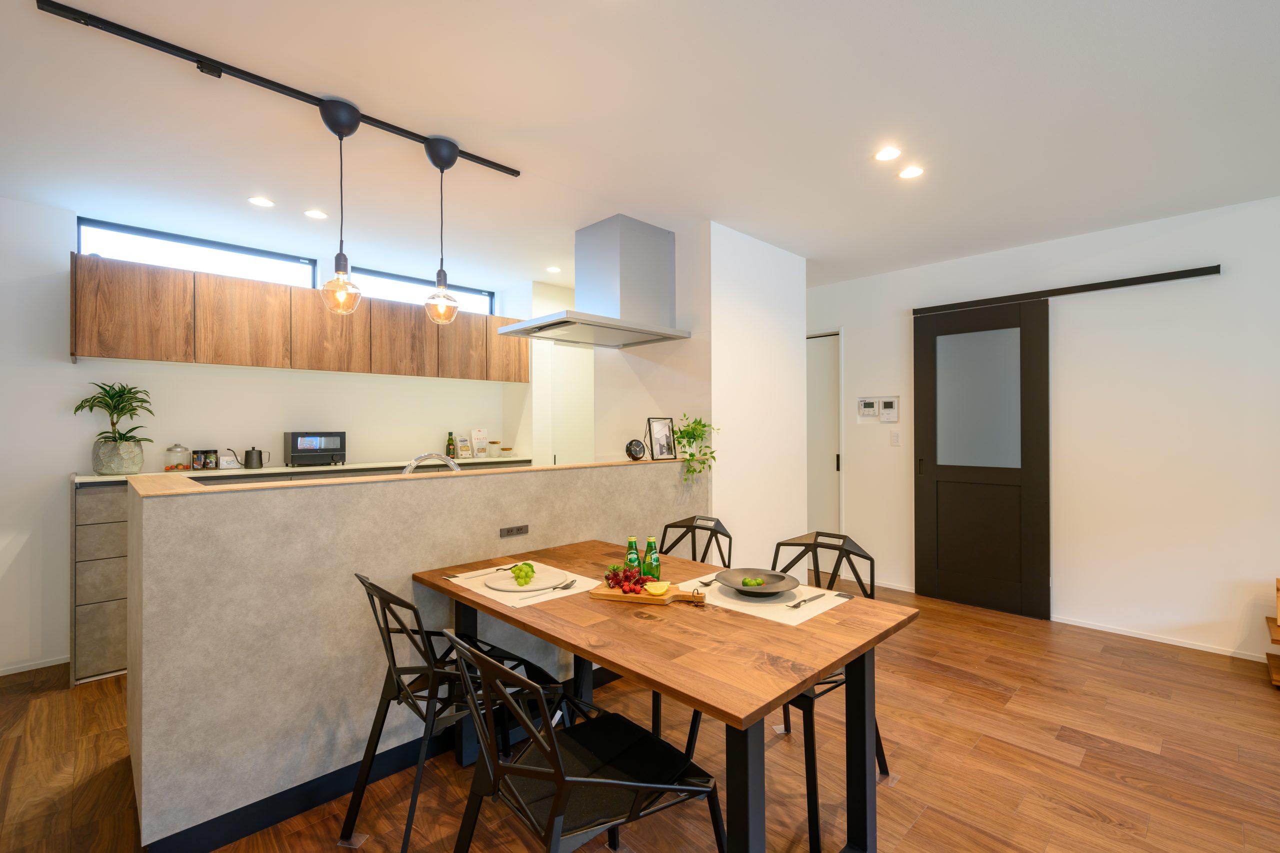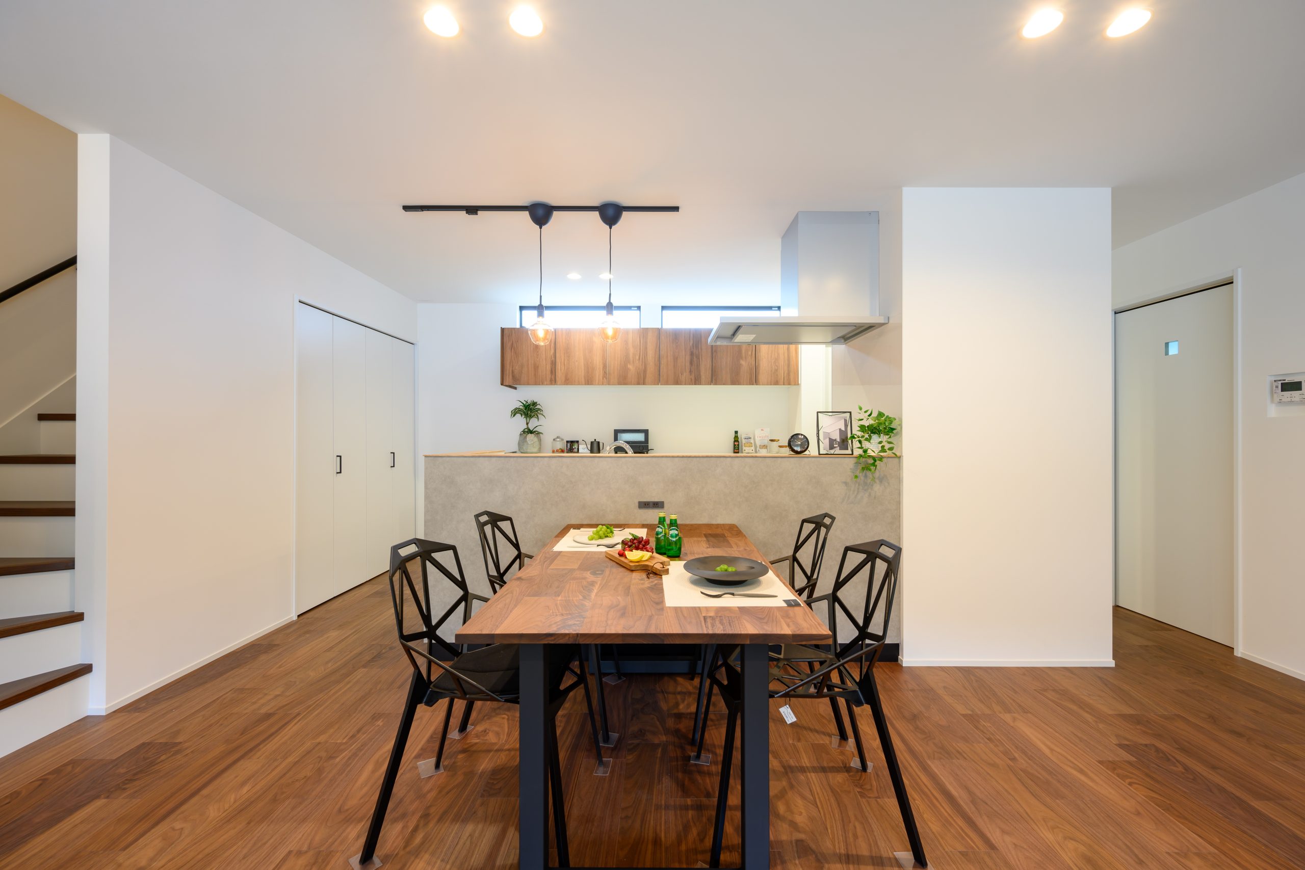 温もり豊かな木目の空間を、黒のライティングやシーリングファンがモダンに引き締め。