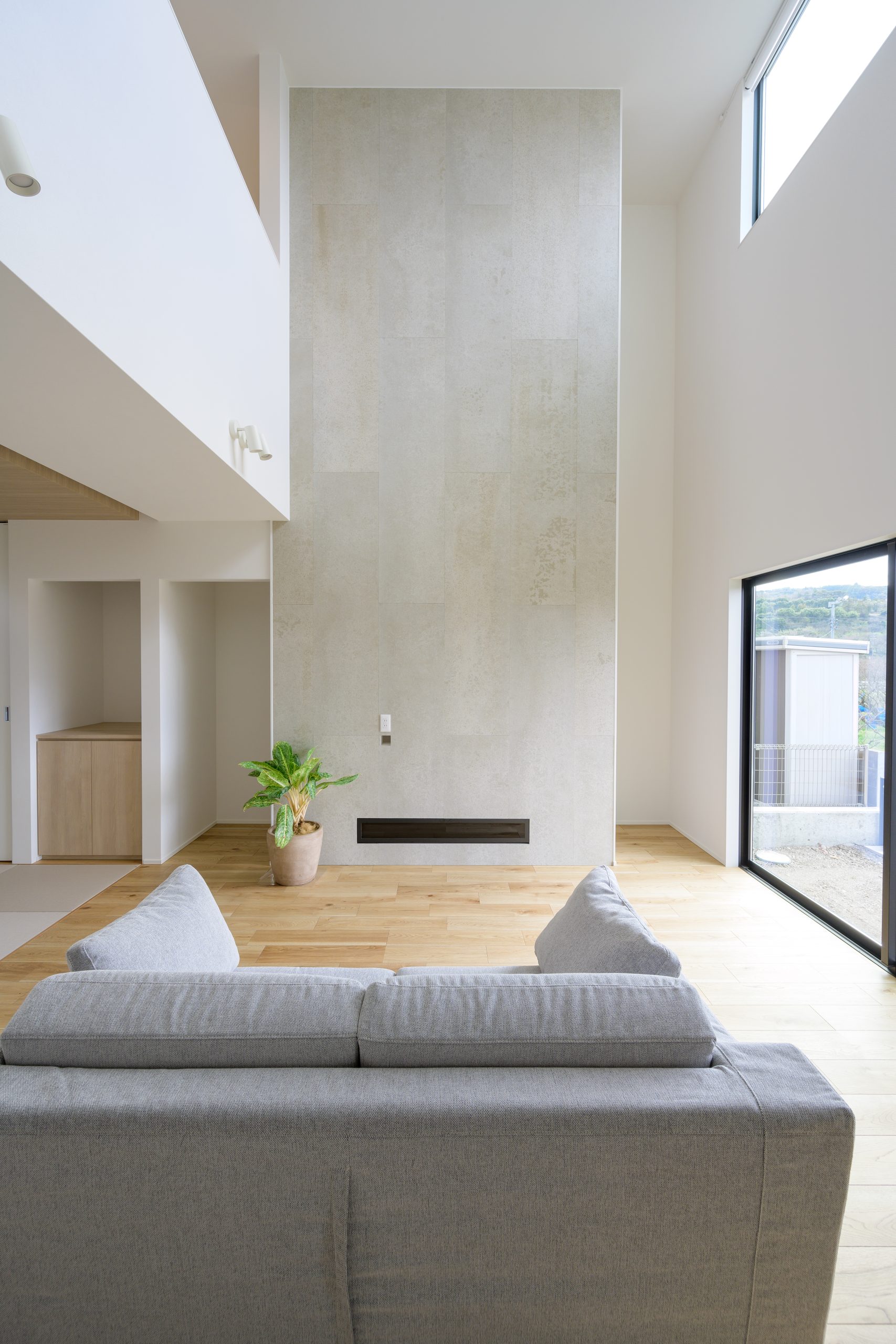 吹き抜けの大きな窓から差し込む陽光が、化粧梁の陰影を美しく描き出します。