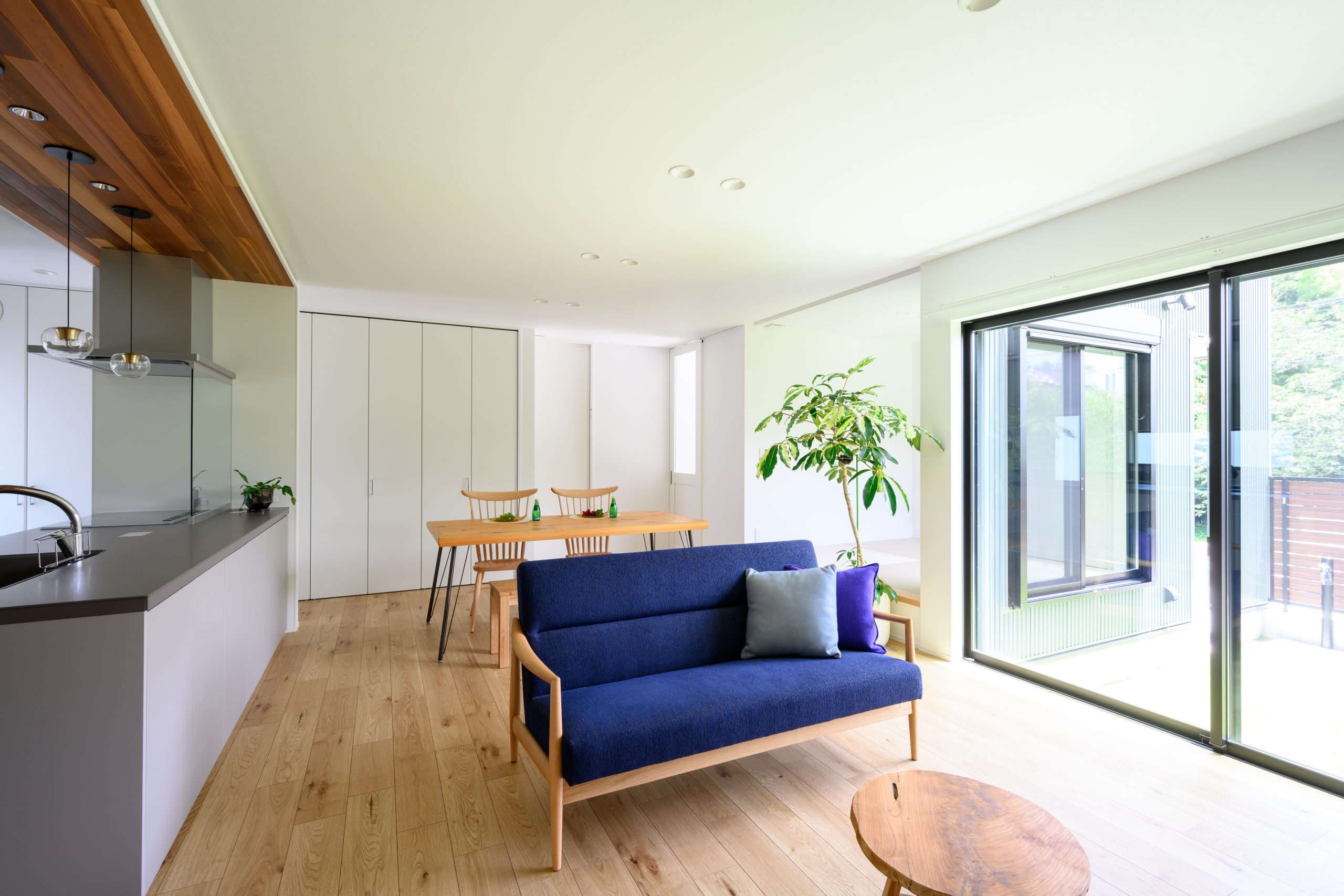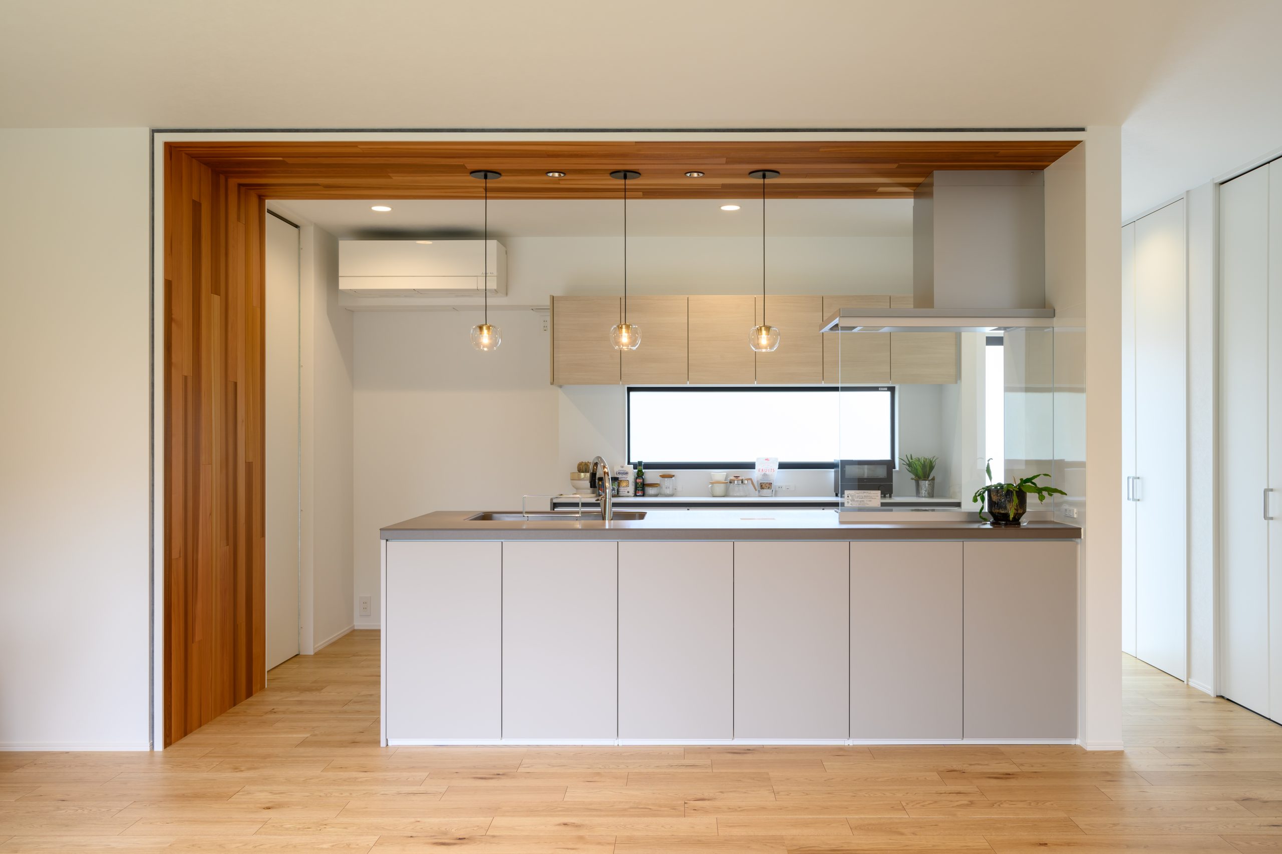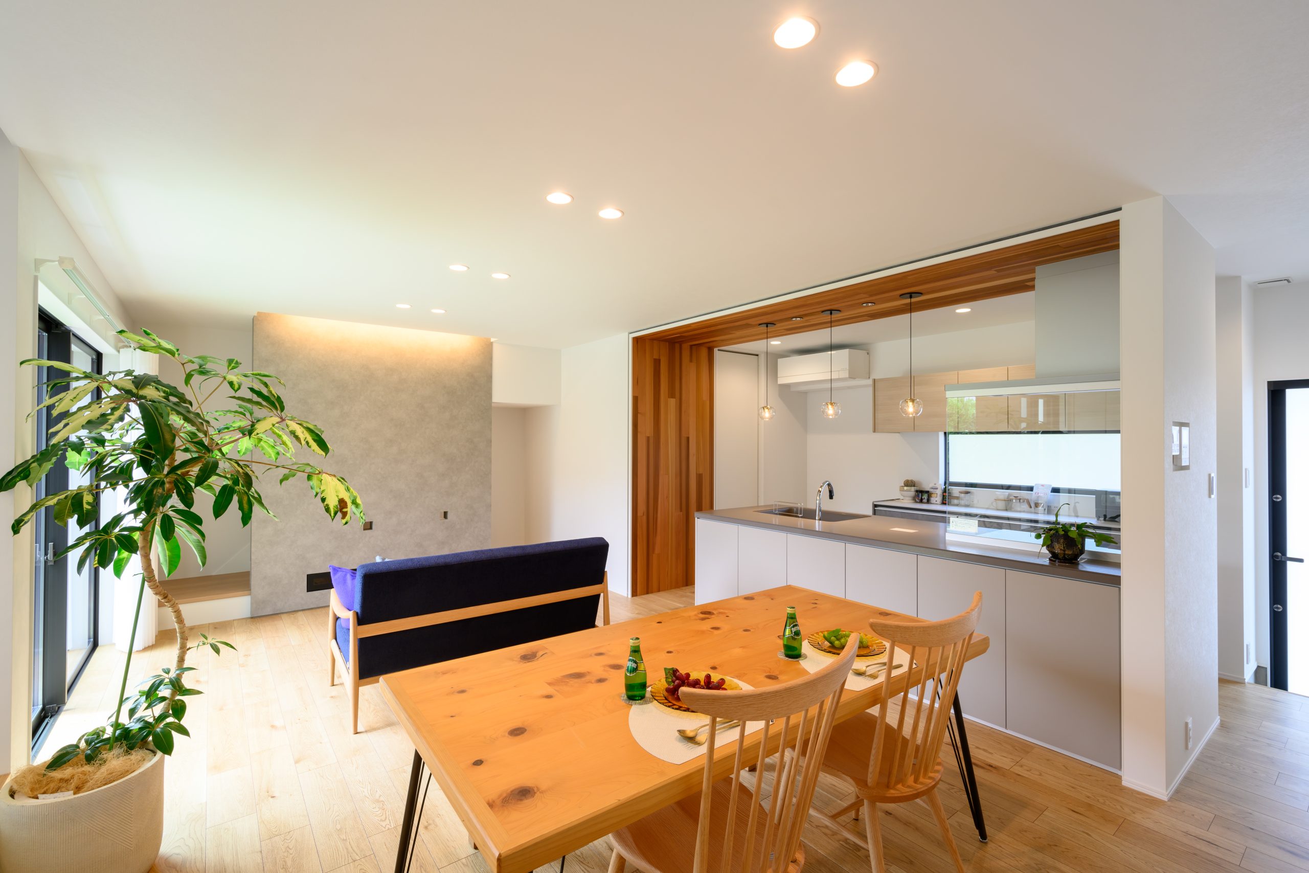 キッチンエリアを木目のフレームで縁取ったような「ゲートデザイン」が、空間に奥行きと上質感をもたらすLDK。 繊細なガラスのペンダントライトがアクセントとなり、まるでカフェのような洗練された雰囲気を演出しています。 背面収納や窓の配置まで計算し尽くされた、機能美あふれる住まいが完成しました。