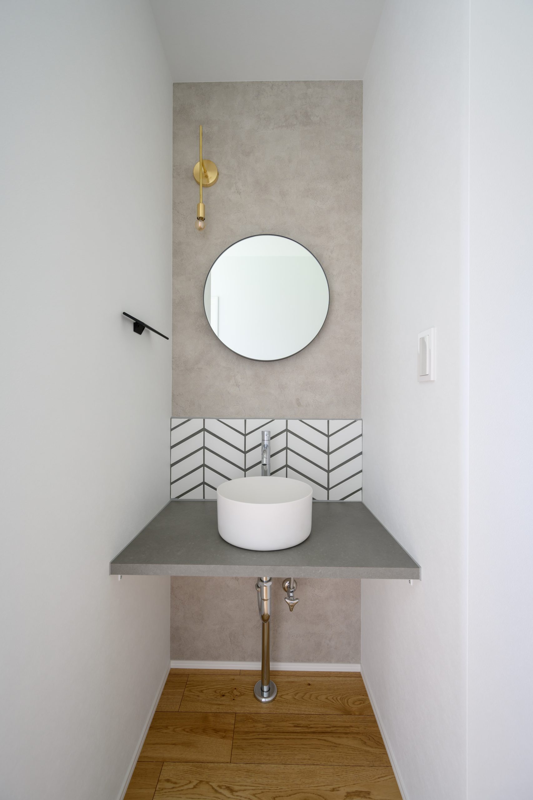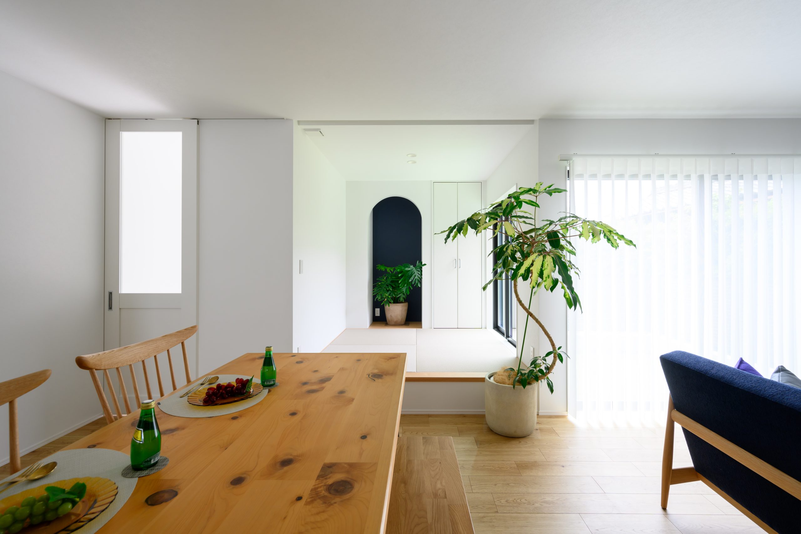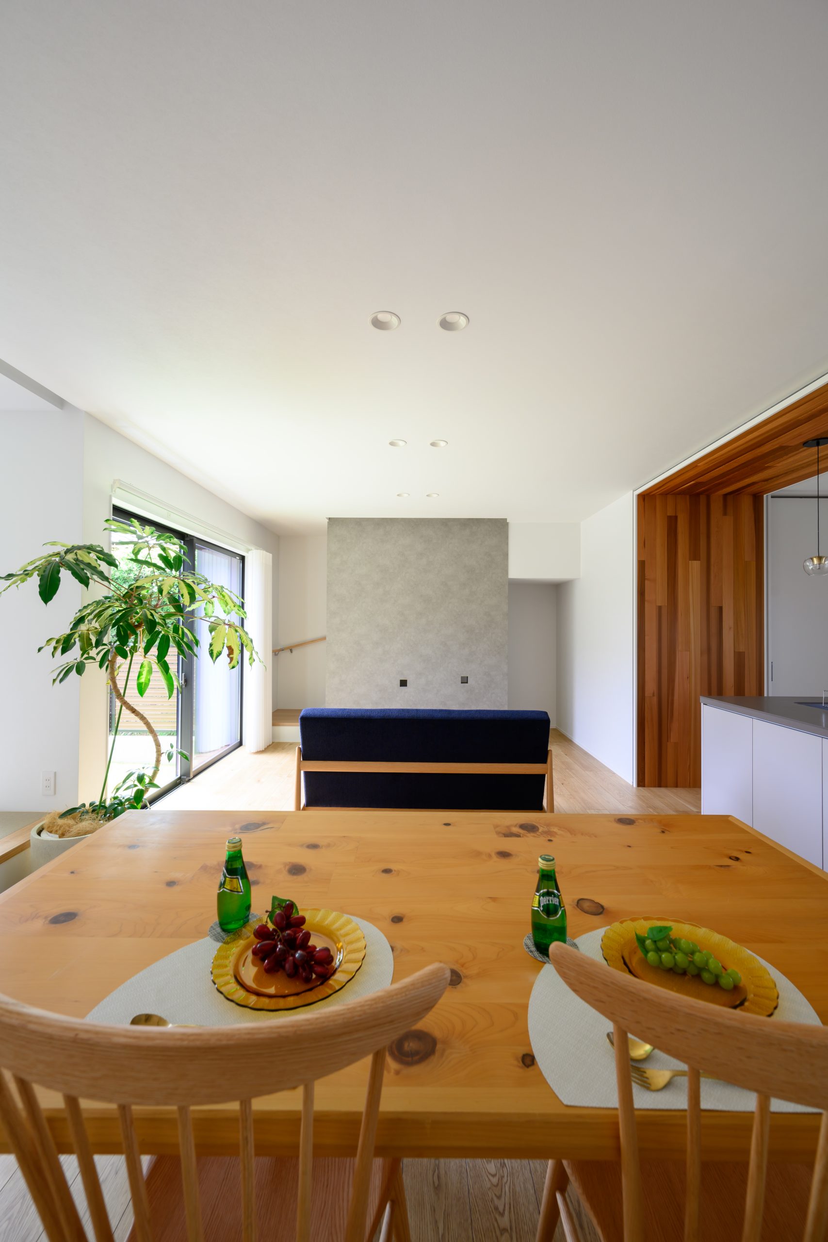 キッチンエリアを木目のフレームで縁取ったような「ゲートデザイン」が、空間に奥行きと上質感をもたらすLDK。 繊細なガラスのペンダントライトがアクセントとなり、まるでカフェのような洗練された雰囲気を演出しています。 背面収納や窓の配置まで計算し尽くされた、機能美あふれる住まいが完成しました。